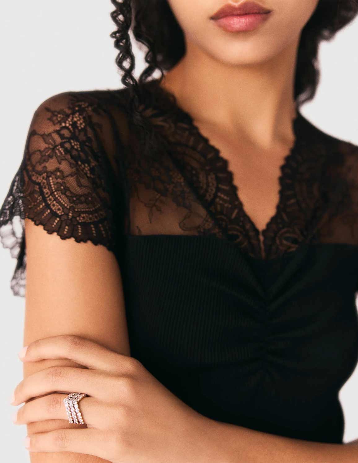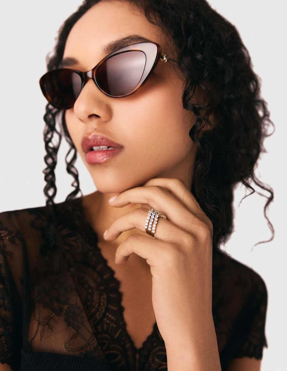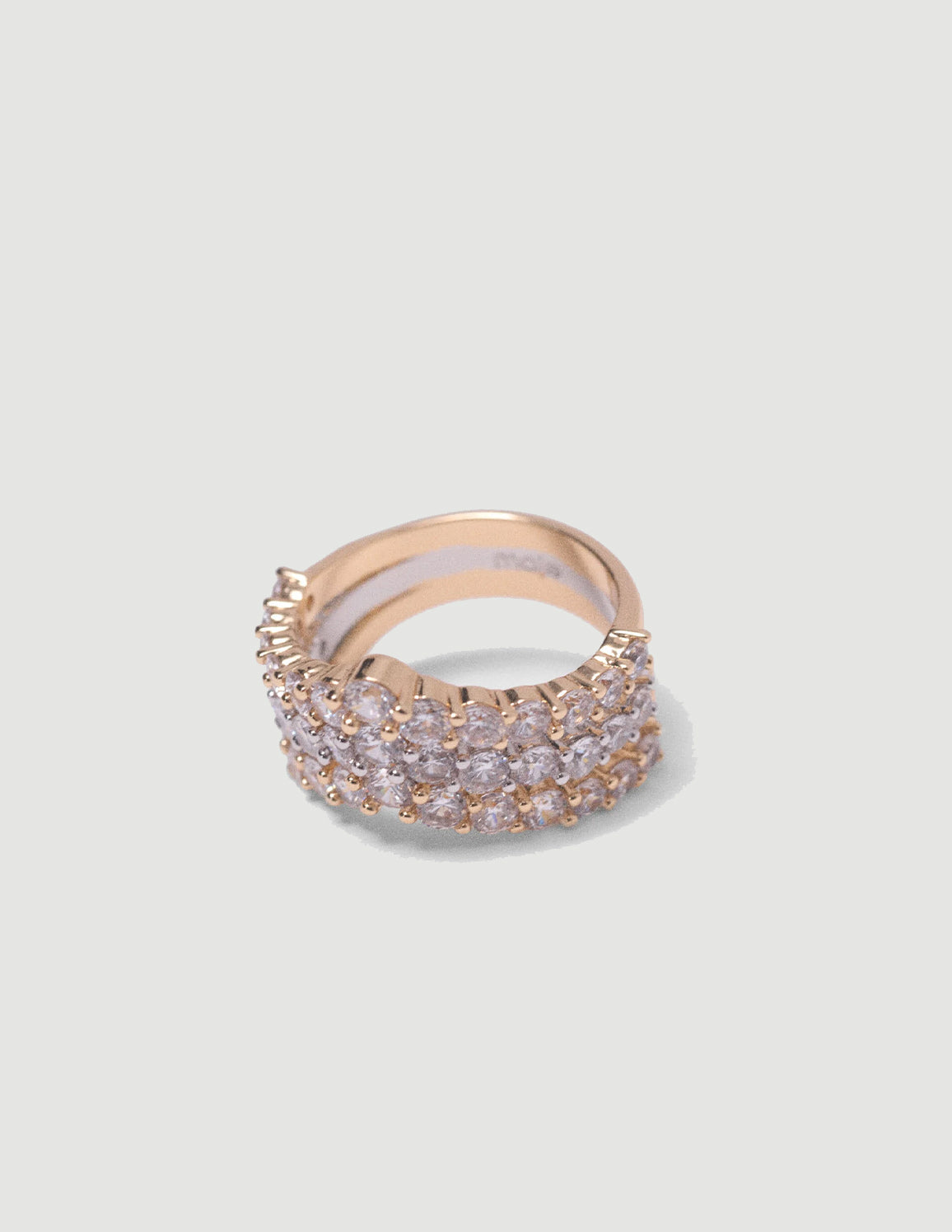 • Its V-shaped structure and full pavé of crystal-style stones adorn the hand with a precious light, while playing on contrasts of texture and colour.