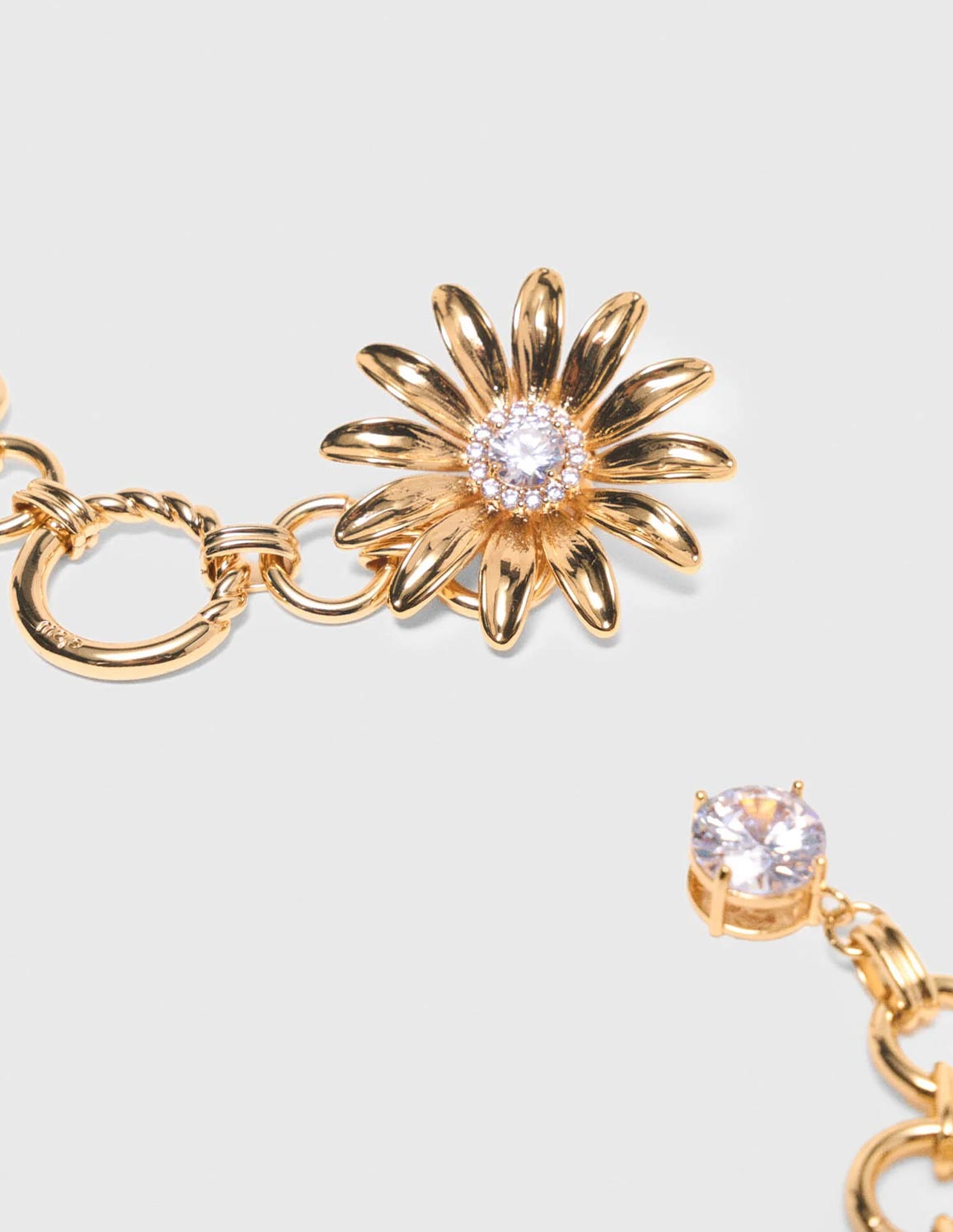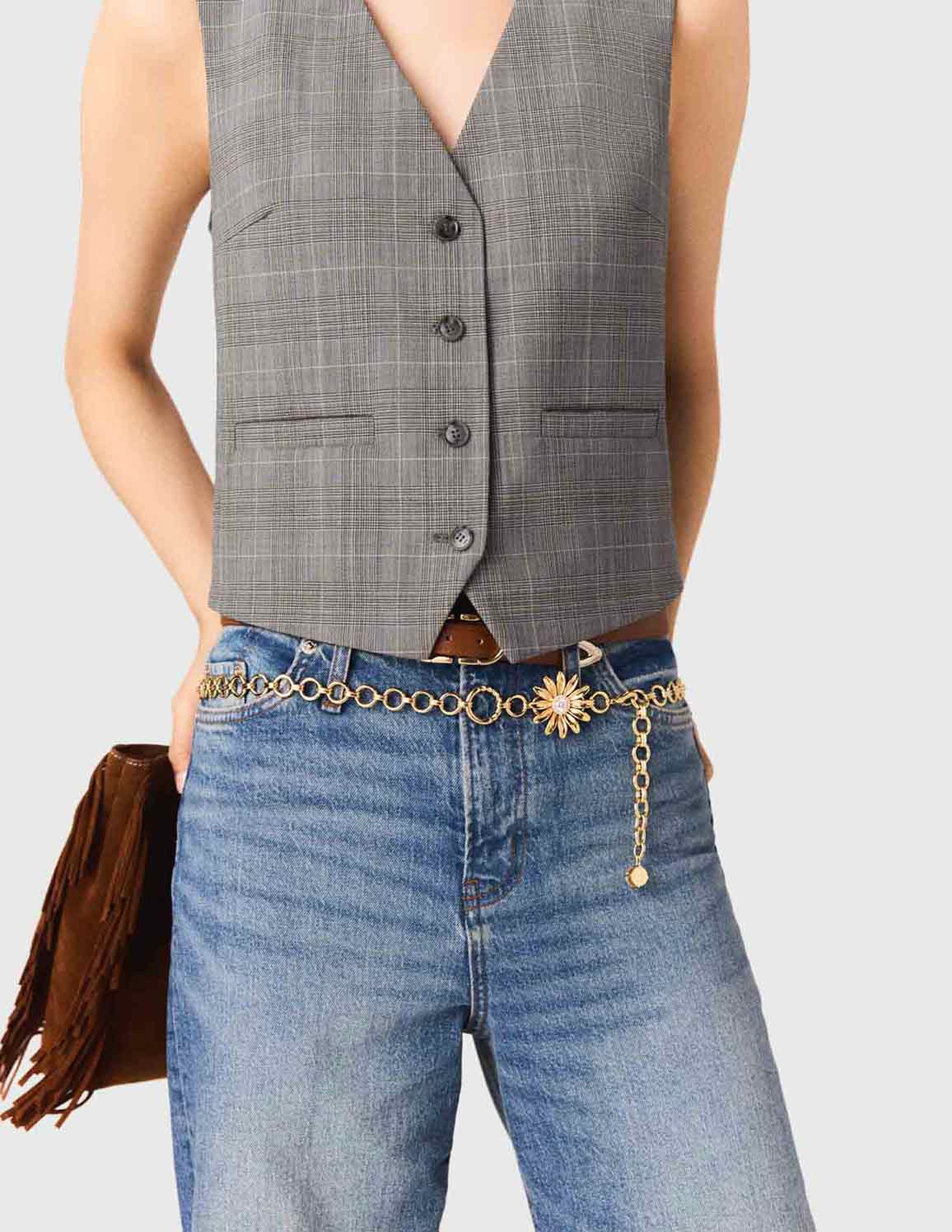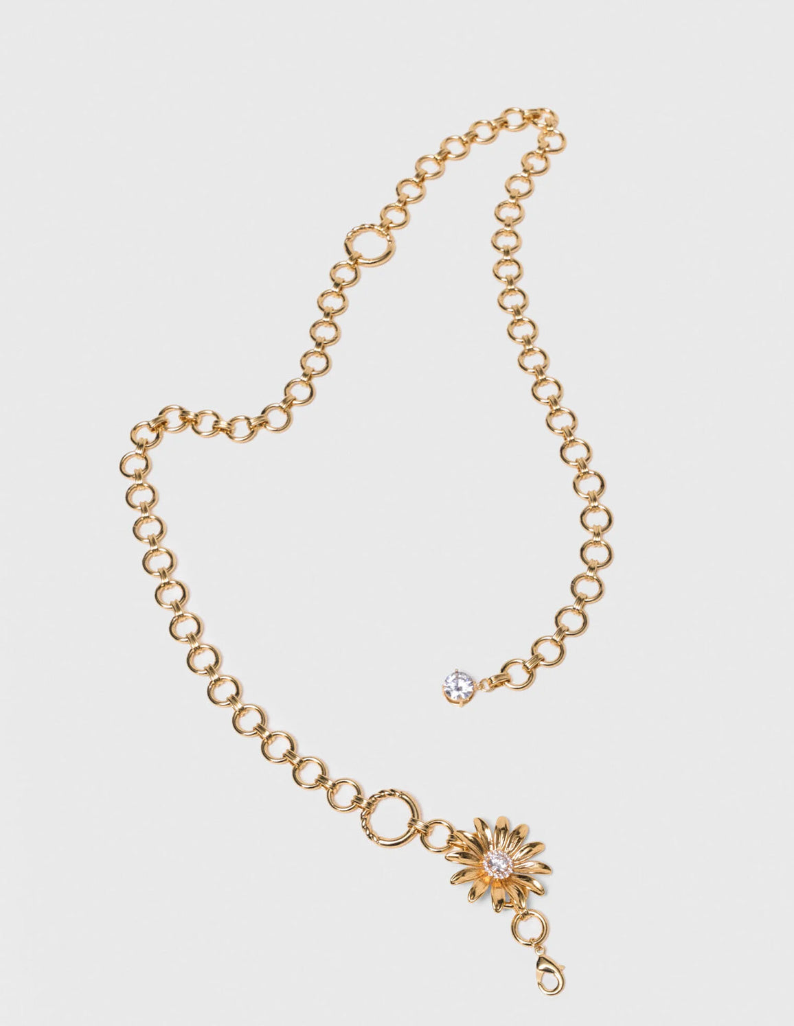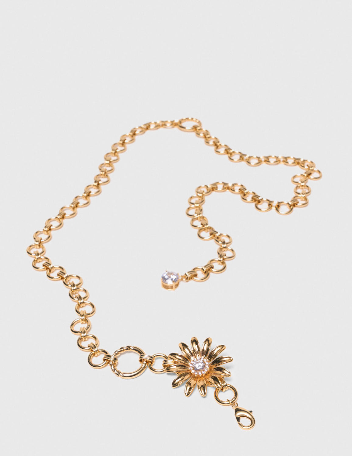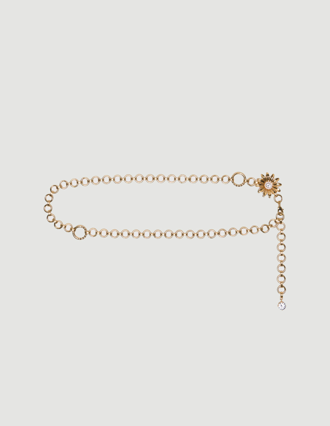This gold-tone chain belt plays on contrasting textures: round, twisted links and a luminous flower set with transparent rhinestones, for a jewel-like detail that catches the light at the waist or on the hips.