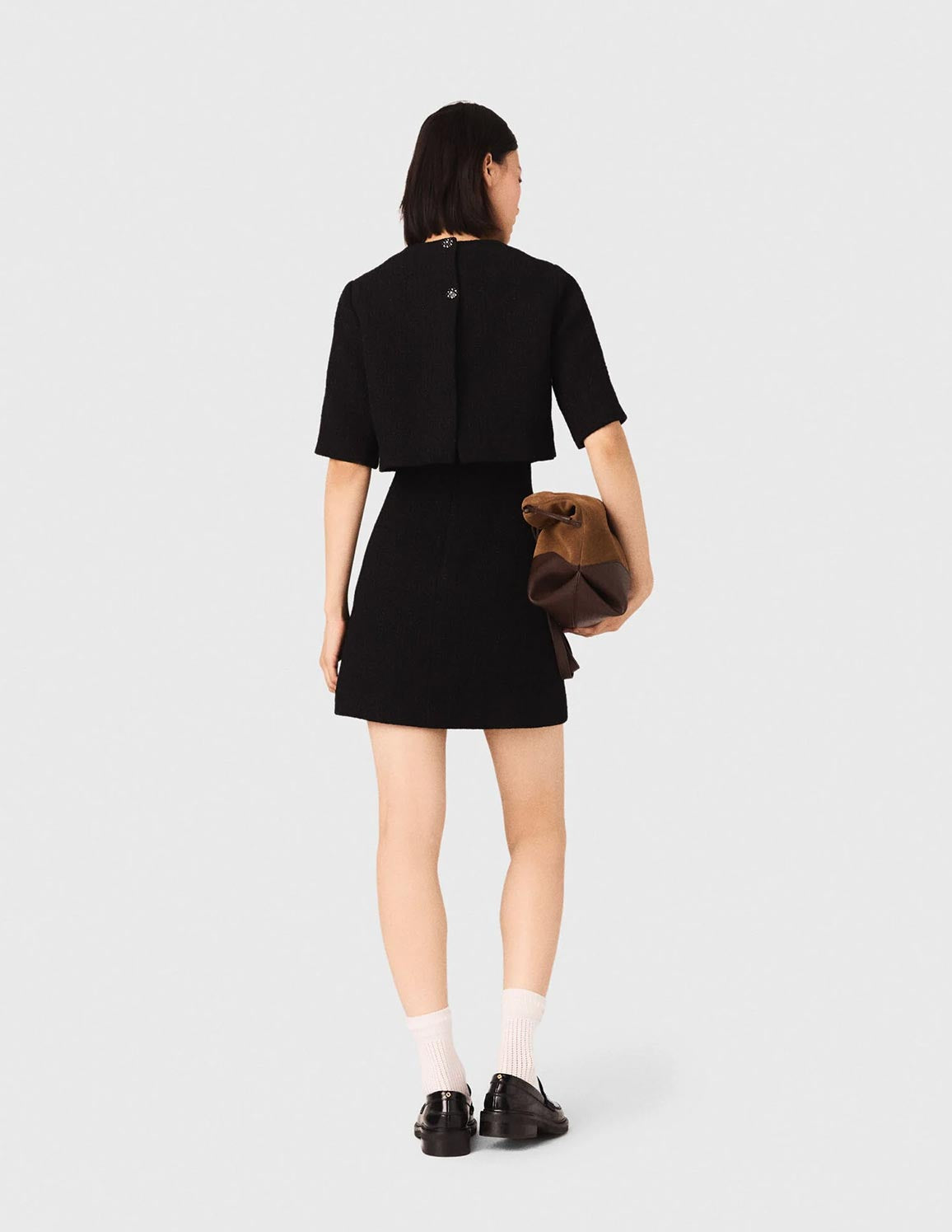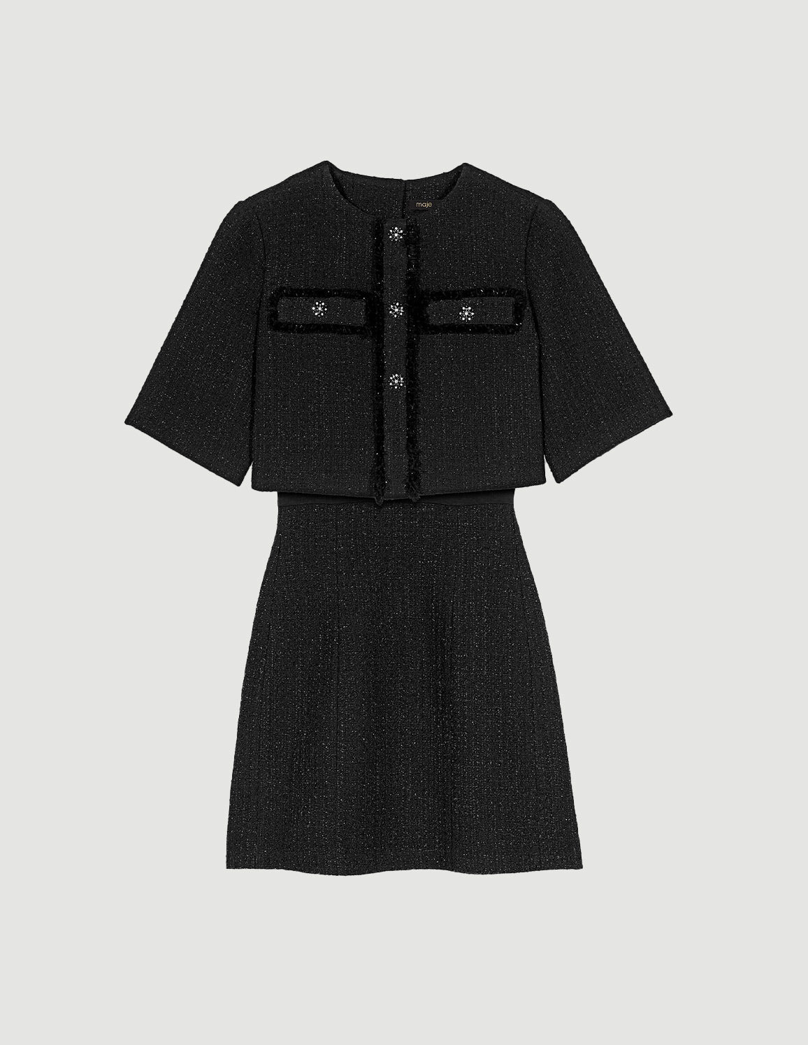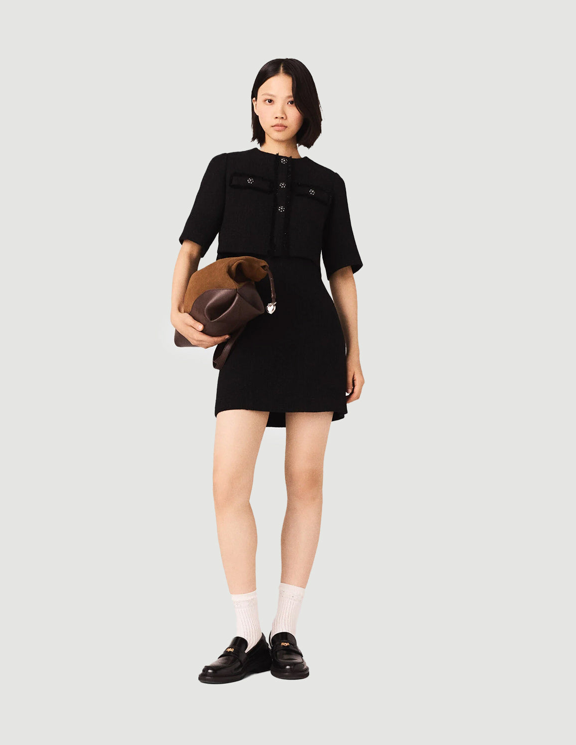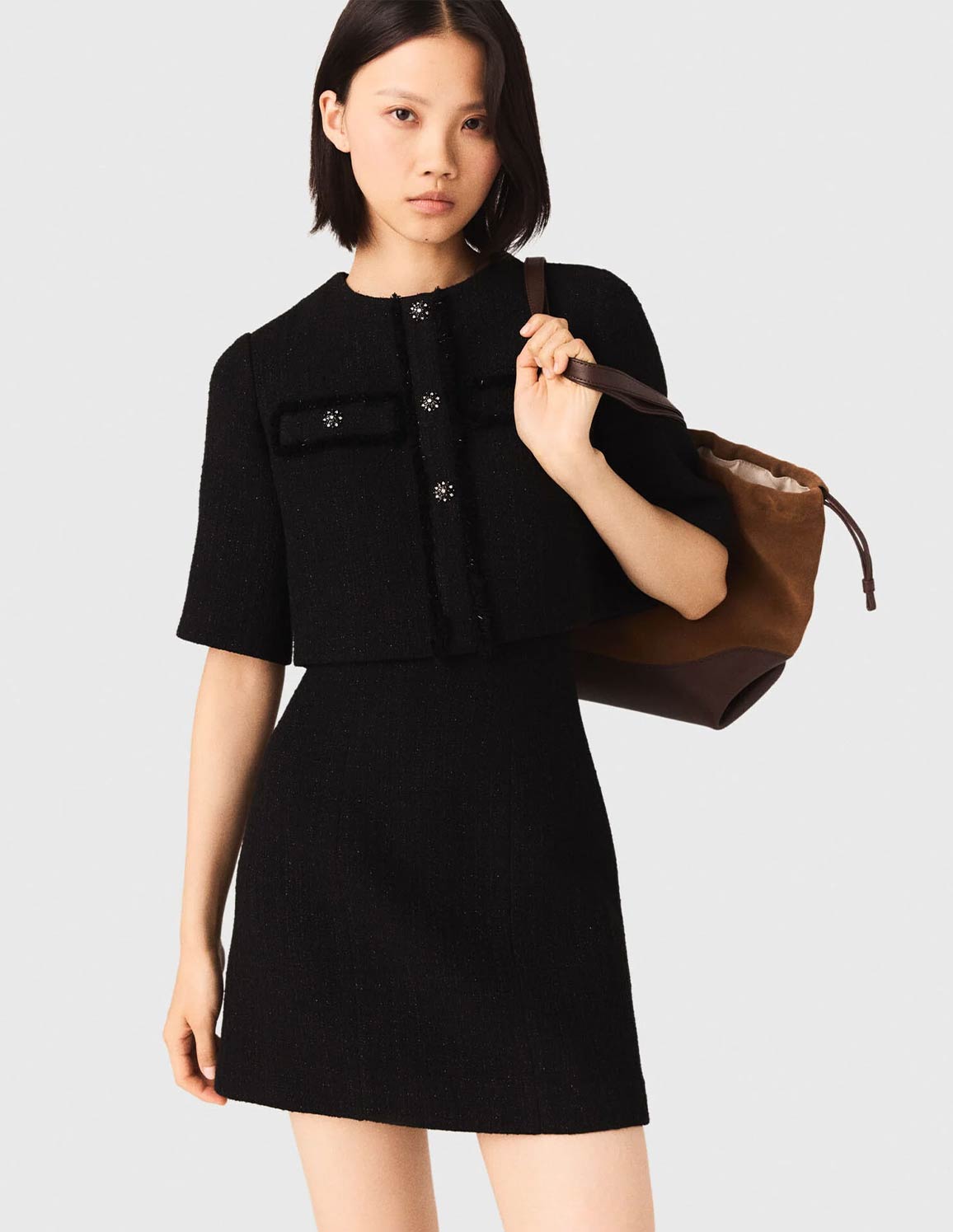 Head back to the city in a piece that combines modernity and sophistication, playing on contrasting materials and a new take on tailoring. This short dual-material dress combines a short-sleeved shimmering tweed cardigan with an A-line tweed skirt, for a chic layered effect and a structured look, emphasised by the fit & flare cut. For a confident look, wear it with leather loafers and a dual-material tote bag.