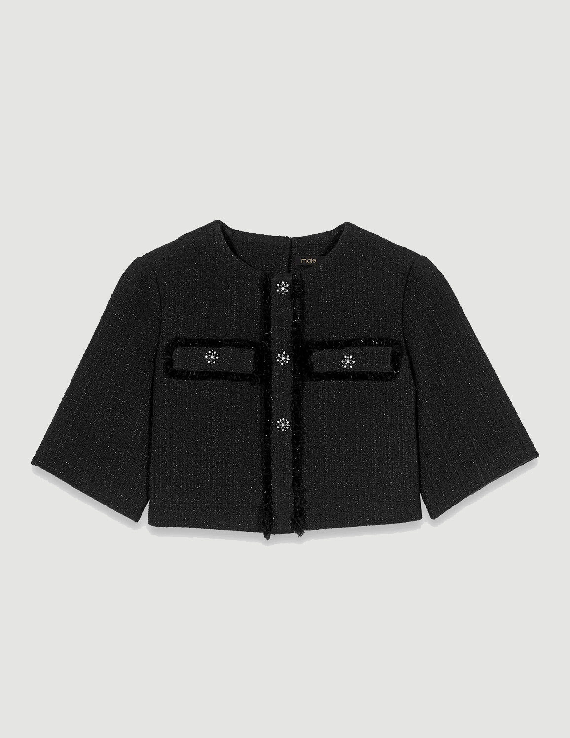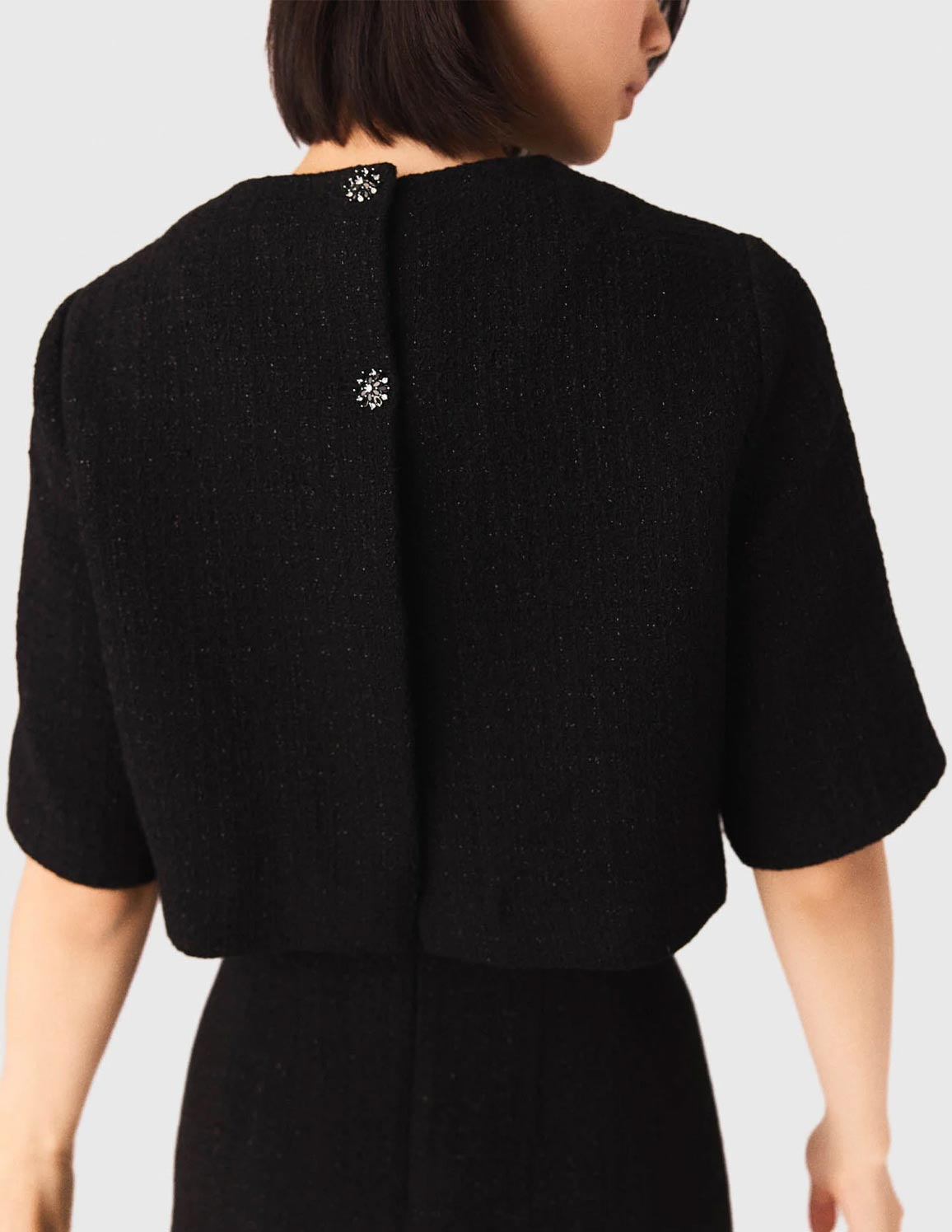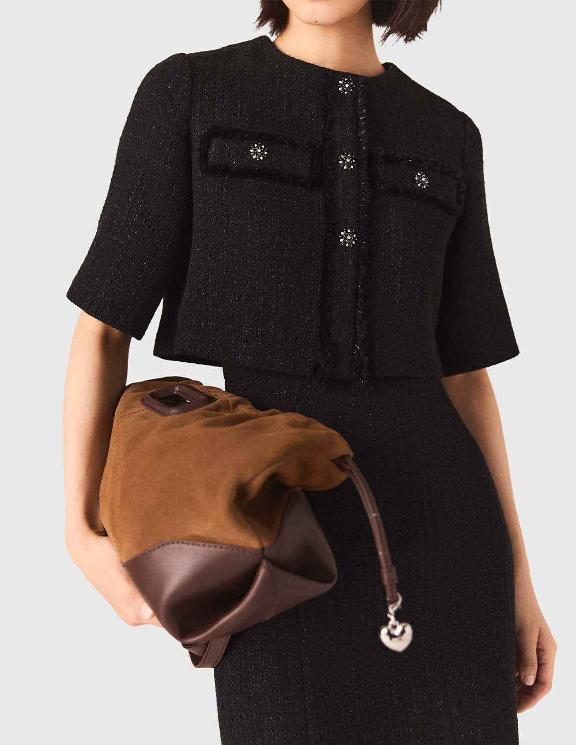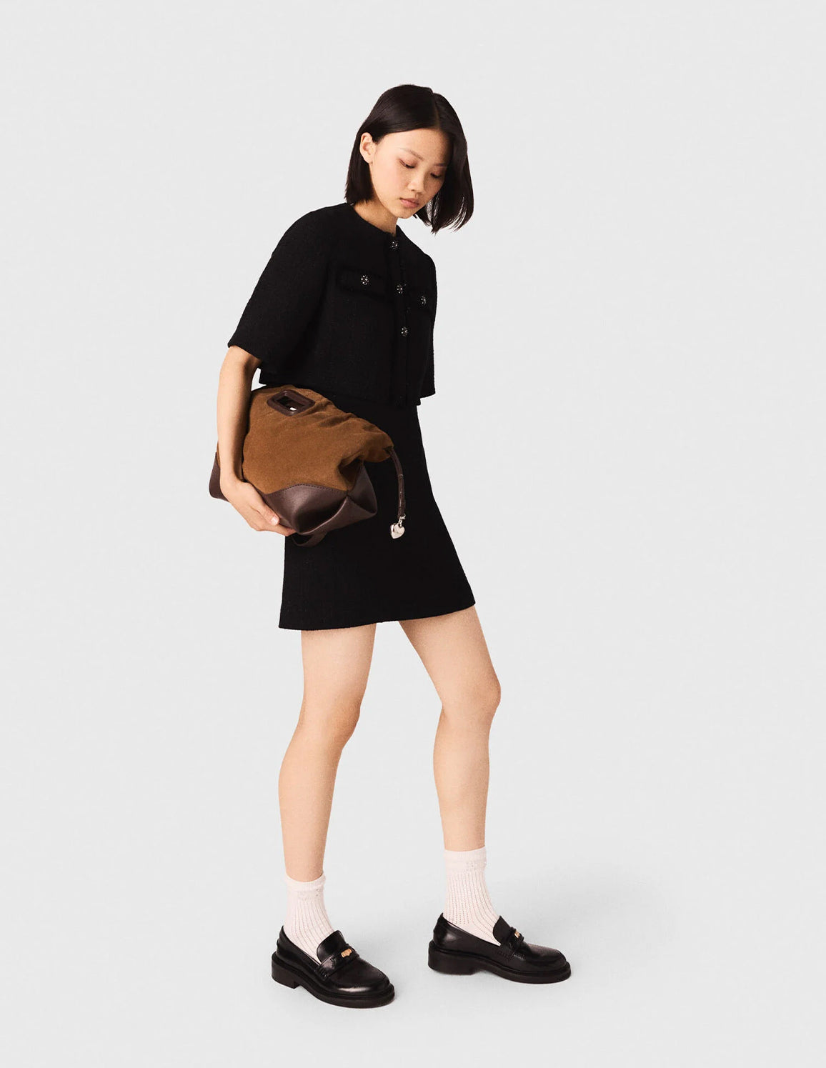 Head back to the city in a piece that combines modernity and sophistication, playing on contrasting materials and a new take on tailoring. This short dual-material dress combines a short-sleeved shimmering tweed cardigan with an A-line tweed skirt, for a chic layered effect and a structured look, emphasised by the fit & flare cut. For a confident look, wear it with leather loafers and a dual-material tote bag.