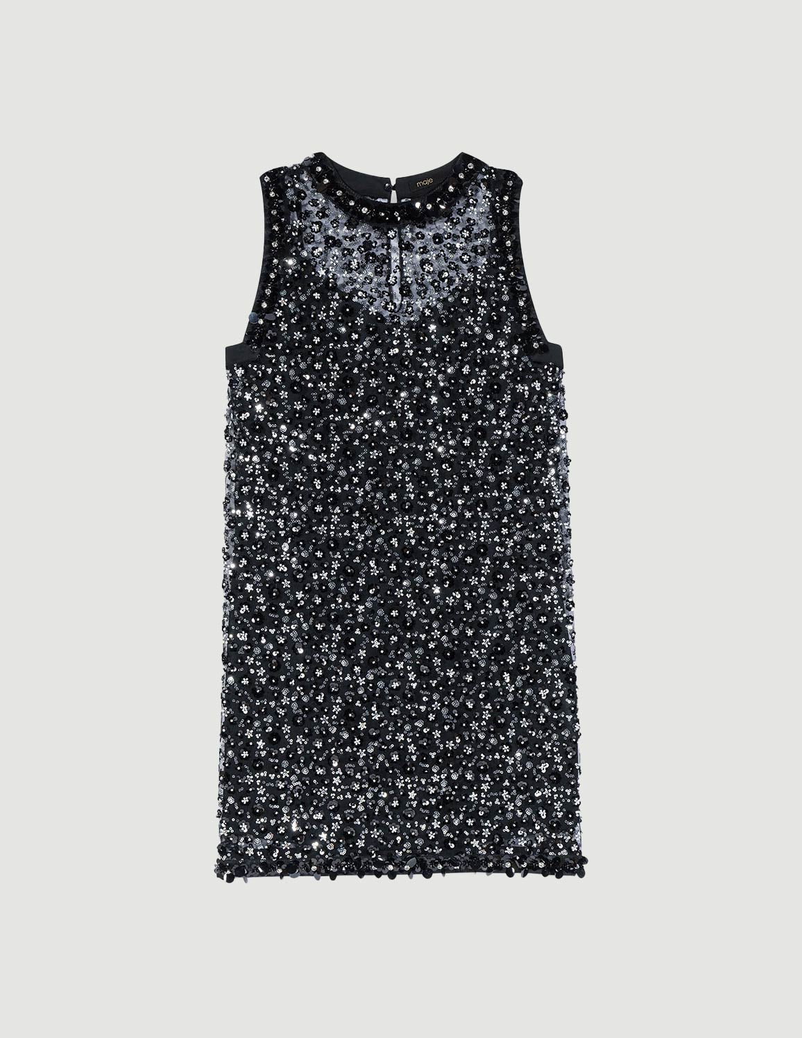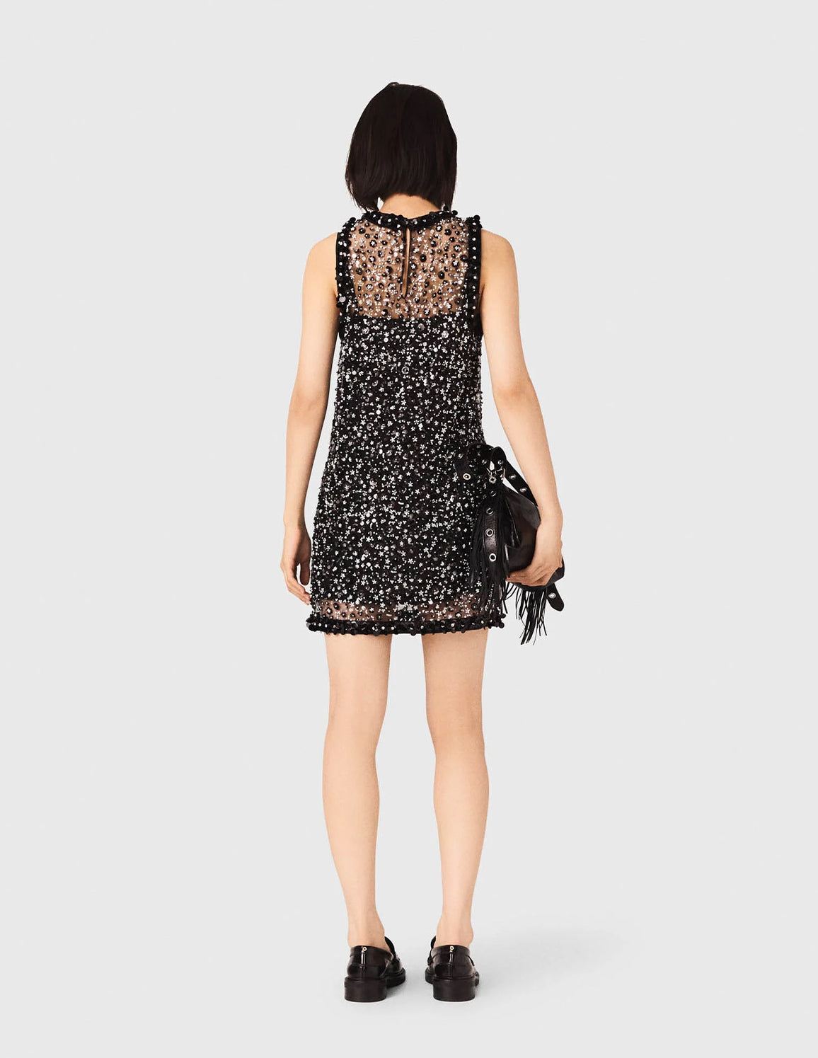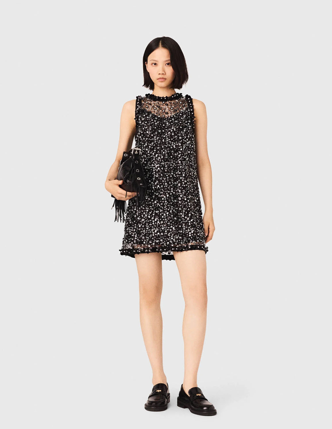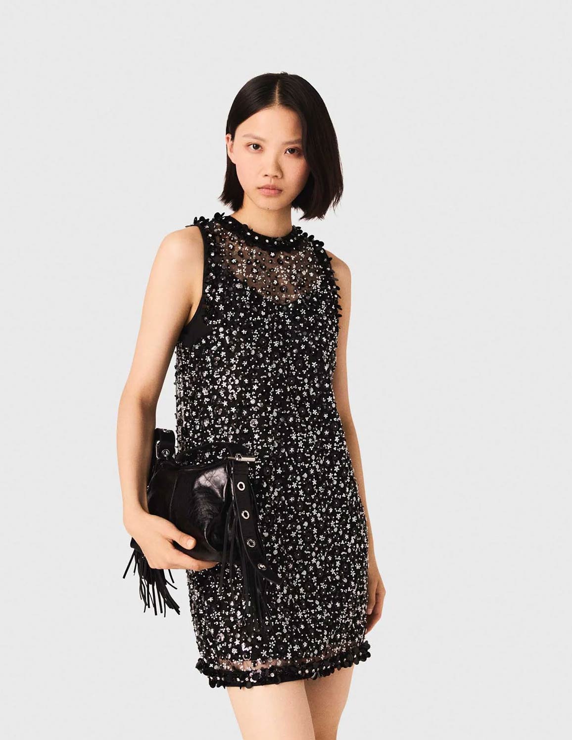 • The collection highlights a sophisticated modern wardrobe, where every detail boldly illuminates the silhouette. This short sleeveless dress captivates with its opulent sequin embroidery, forming a dense floral pattern on a transparent tulle base that delicately reveals the upper bust. The collar and scalloped hem create a couture look, combining refined transparency with a luminous shine.For a bold, graphic silhouette, pair it with a black leather fringed bag and chunky loafers to play on the contrasting materials.