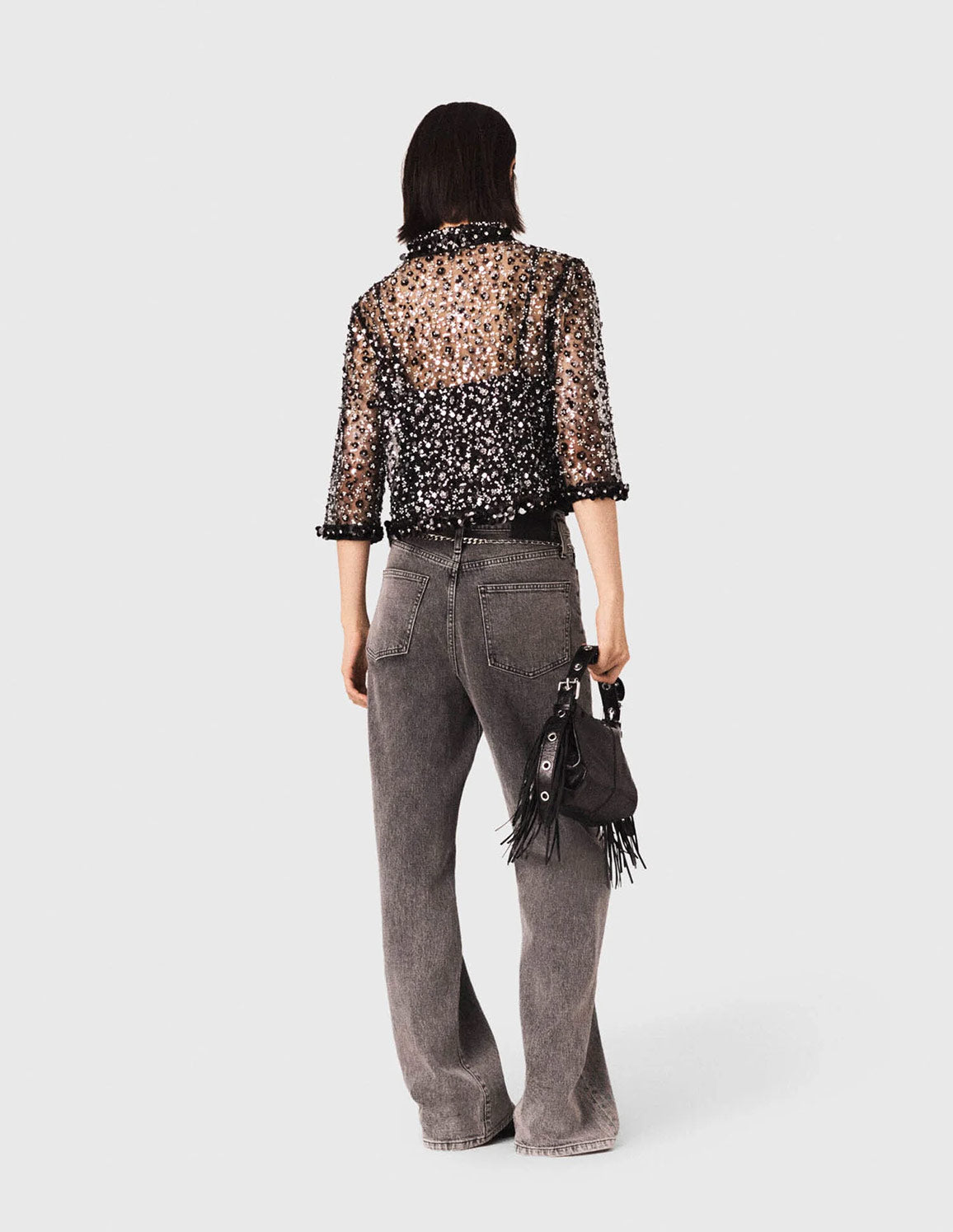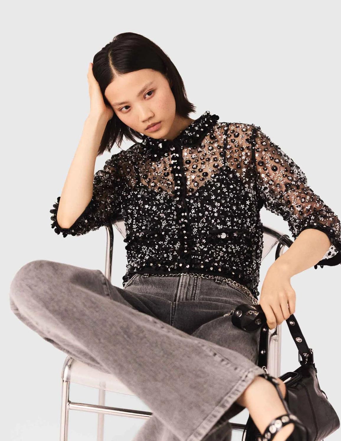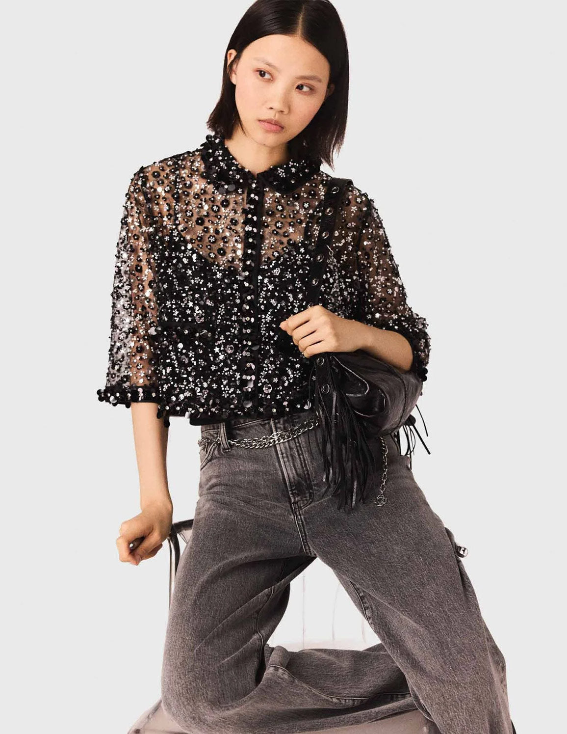 • An metropolitan start to the new season, combining confident style with touches of sparkle. This crop shirt reinvents sheerness with a tulle embroidered with sequins and beads, playing on a dazzling silver ombré effect and a contrast of textures between matte velvet, playful pompoms and the shine of the embellishments. Wear it over a black bustier top, with wide-leg anthracite grey jeans, a fringed bag and studded shoes for a sophisticated nighttime silhouette, with the added twist of a silver chain.