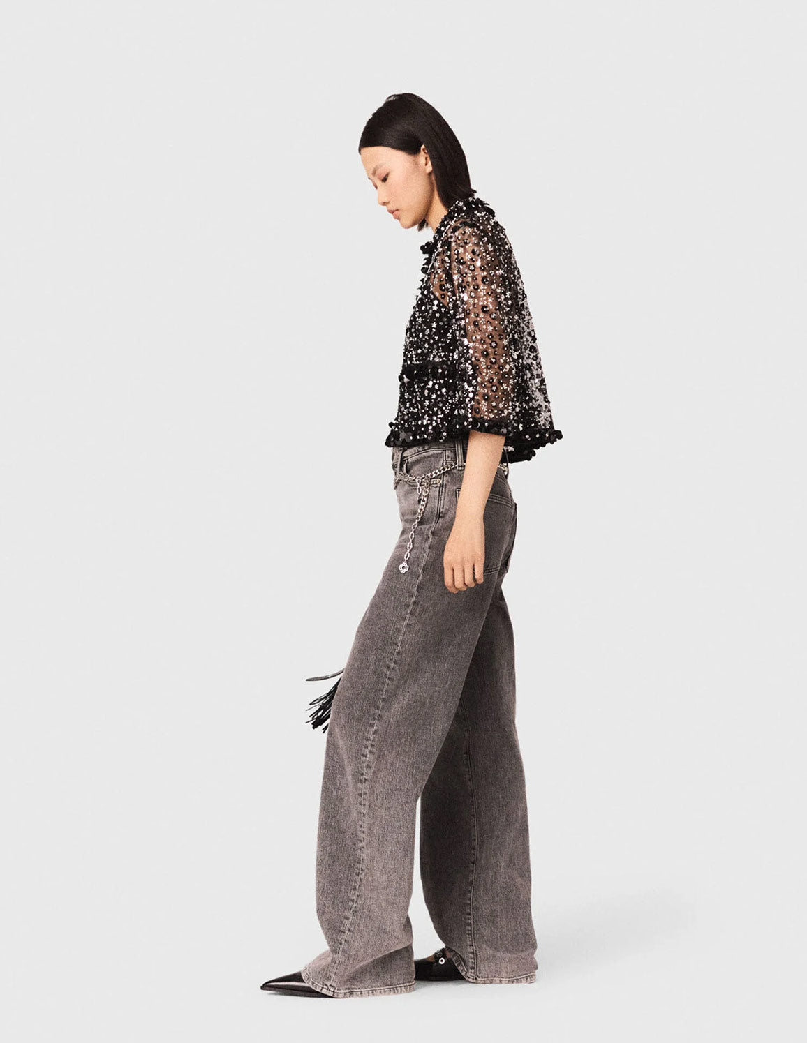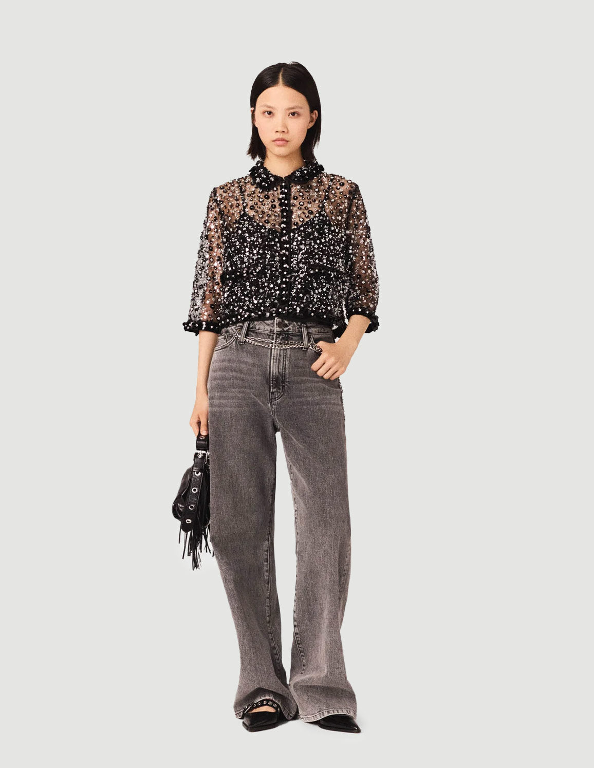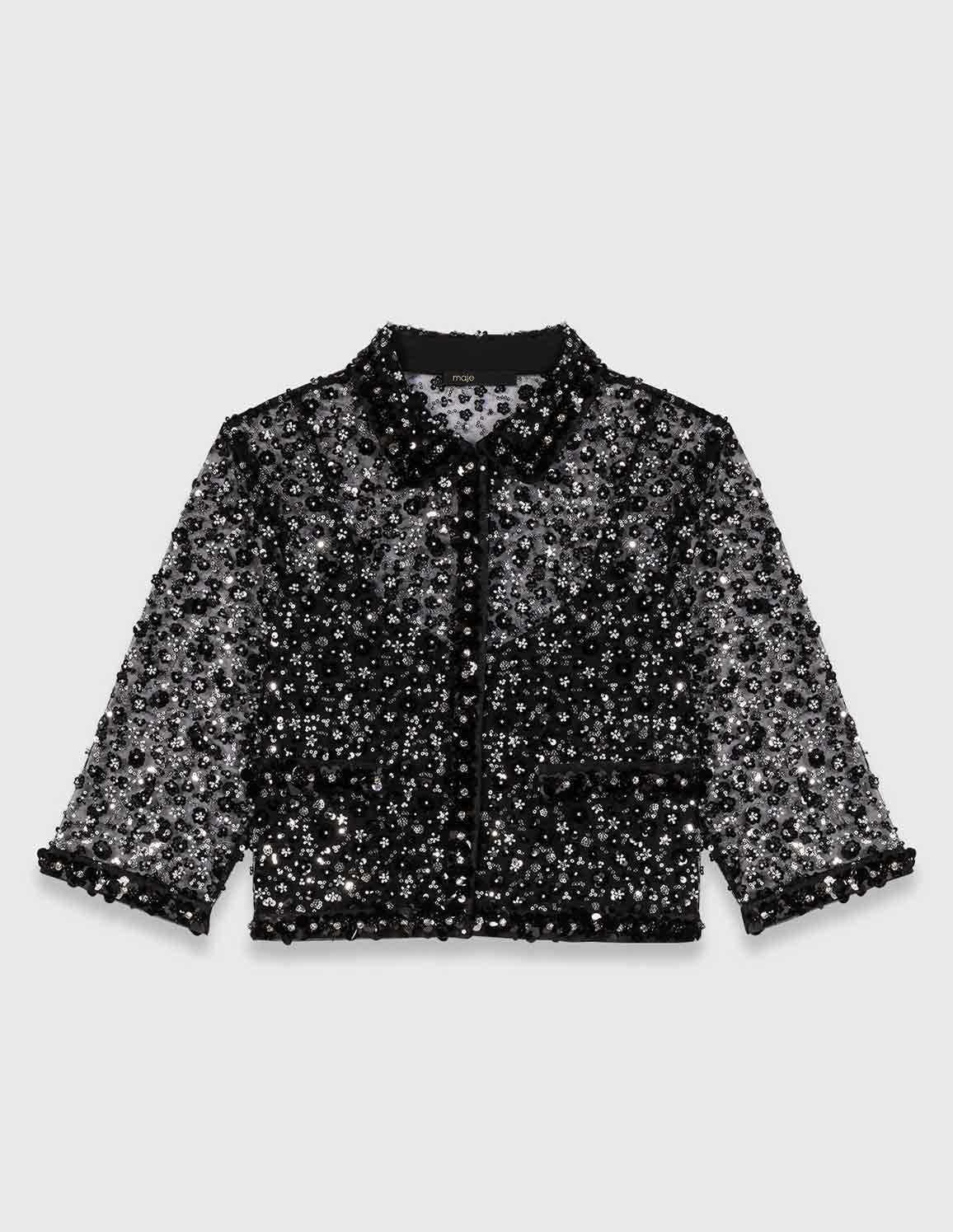 • An metropolitan start to the new season, combining confident style with touches of sparkle. This crop shirt reinvents sheerness with a tulle embroidered with sequins and beads, playing on a dazzling silver ombré effect and a contrast of textures between matte velvet, playful pompoms and the shine of the embellishments. Wear it over a black bustier top, with wide-leg anthracite grey jeans, a fringed bag and studded shoes for a sophisticated nighttime silhouette, with the added twist of a silver chain.
