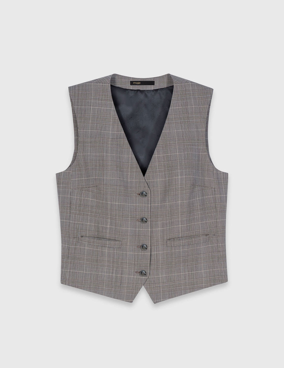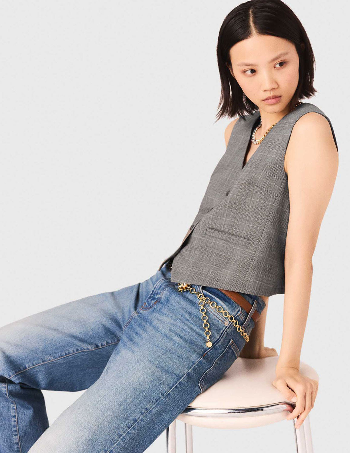 A return to confident metropolitan elegance, where graphic lines and fine materials take centre stage to reinvent everyday wear. This short, sleeveless tailored waistcoat, made from wool, has a fitted cut enhanced by a V-neckline, welt pockets and a pointed hem for a structured, refined look. For a resolutely modern silhouette, pair it with high-waisted jeans, a gold chain belt and a fringed clutch.