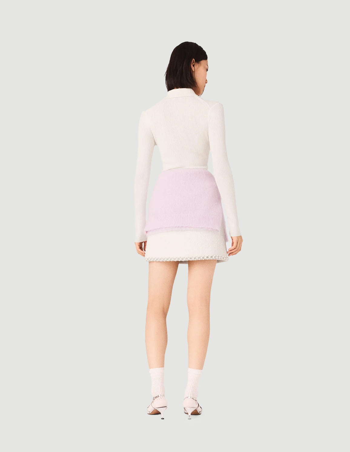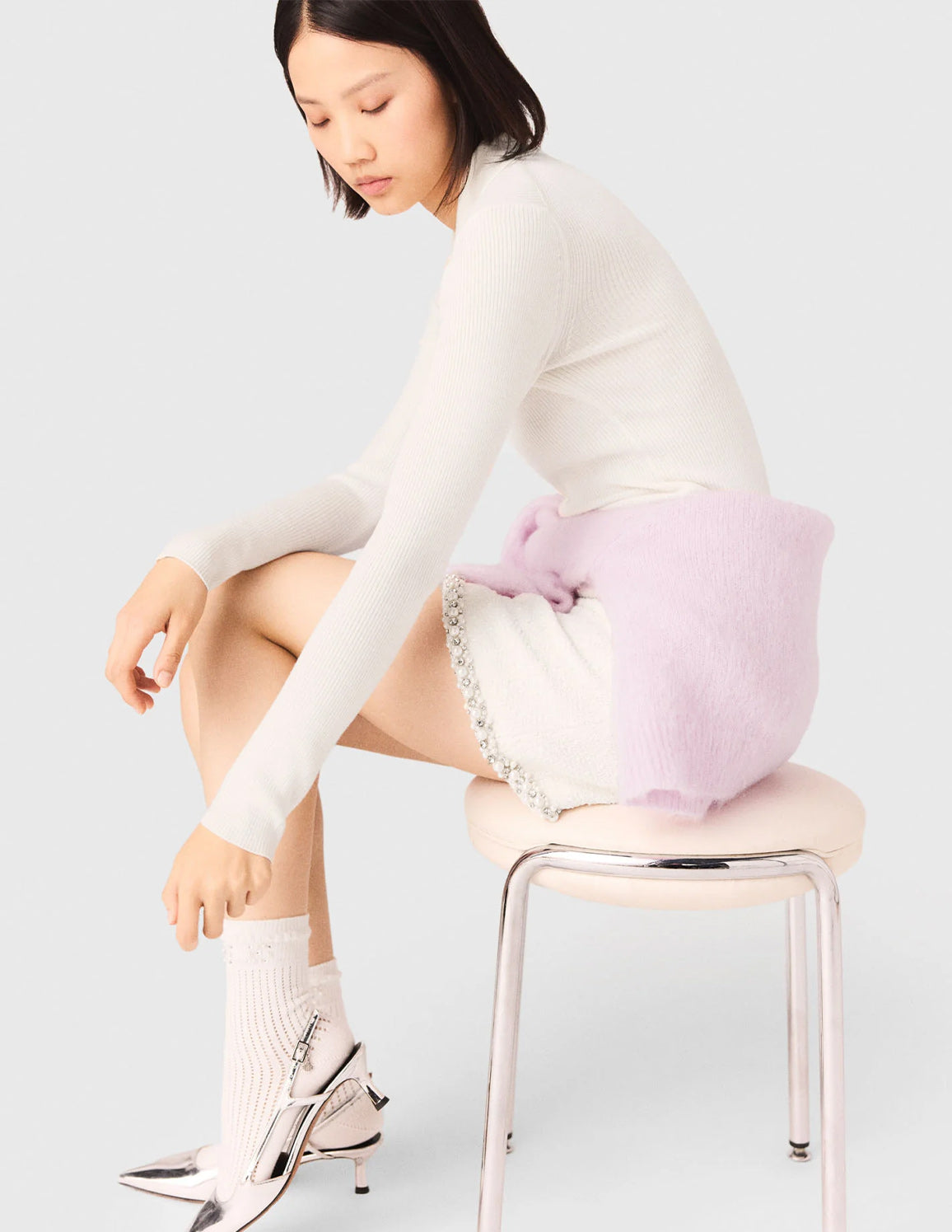 • Wear it with the ecru mini skirt embellished with rhinestones, the lilac jumper tied at the waist, ribbed socks and silver court shoes to create a luminous and assertive play on textures.
