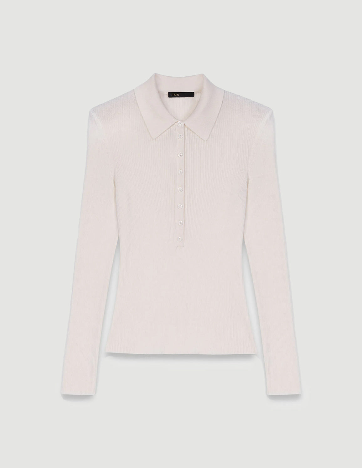 • This fitted rib knit jumper enhances the figure with its body-hugging fit, refined polo collar and the natural sheen of the silk blended with ecru wool.