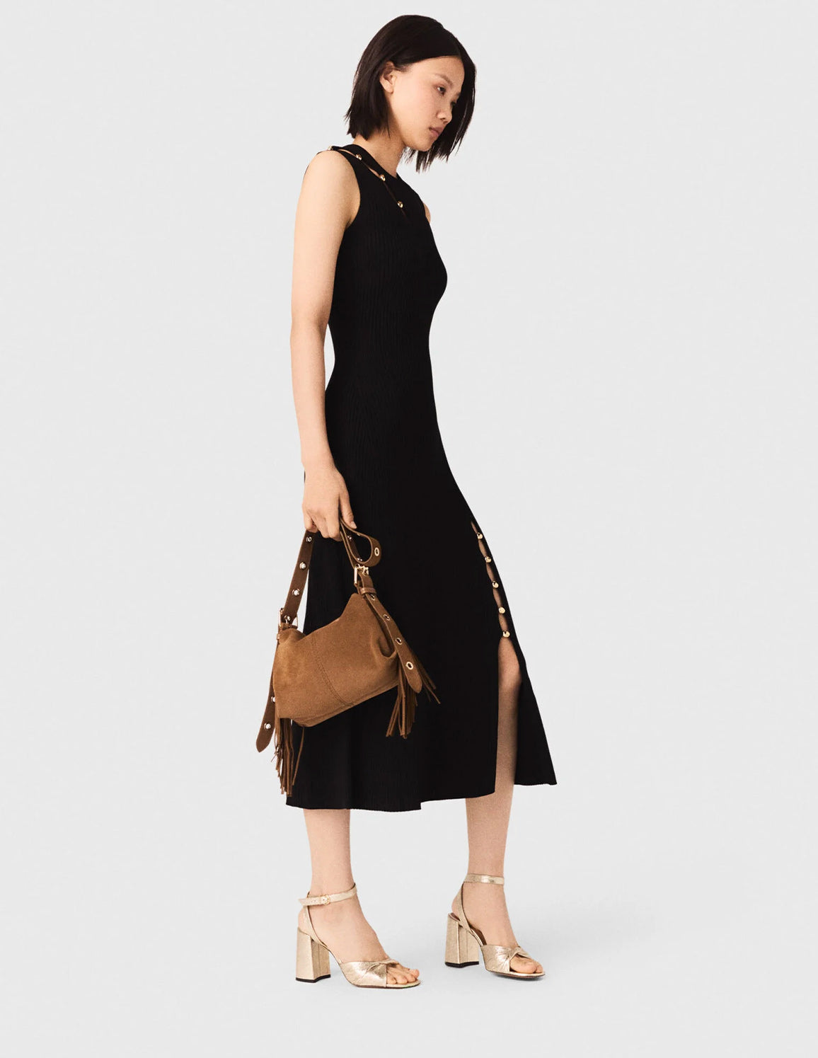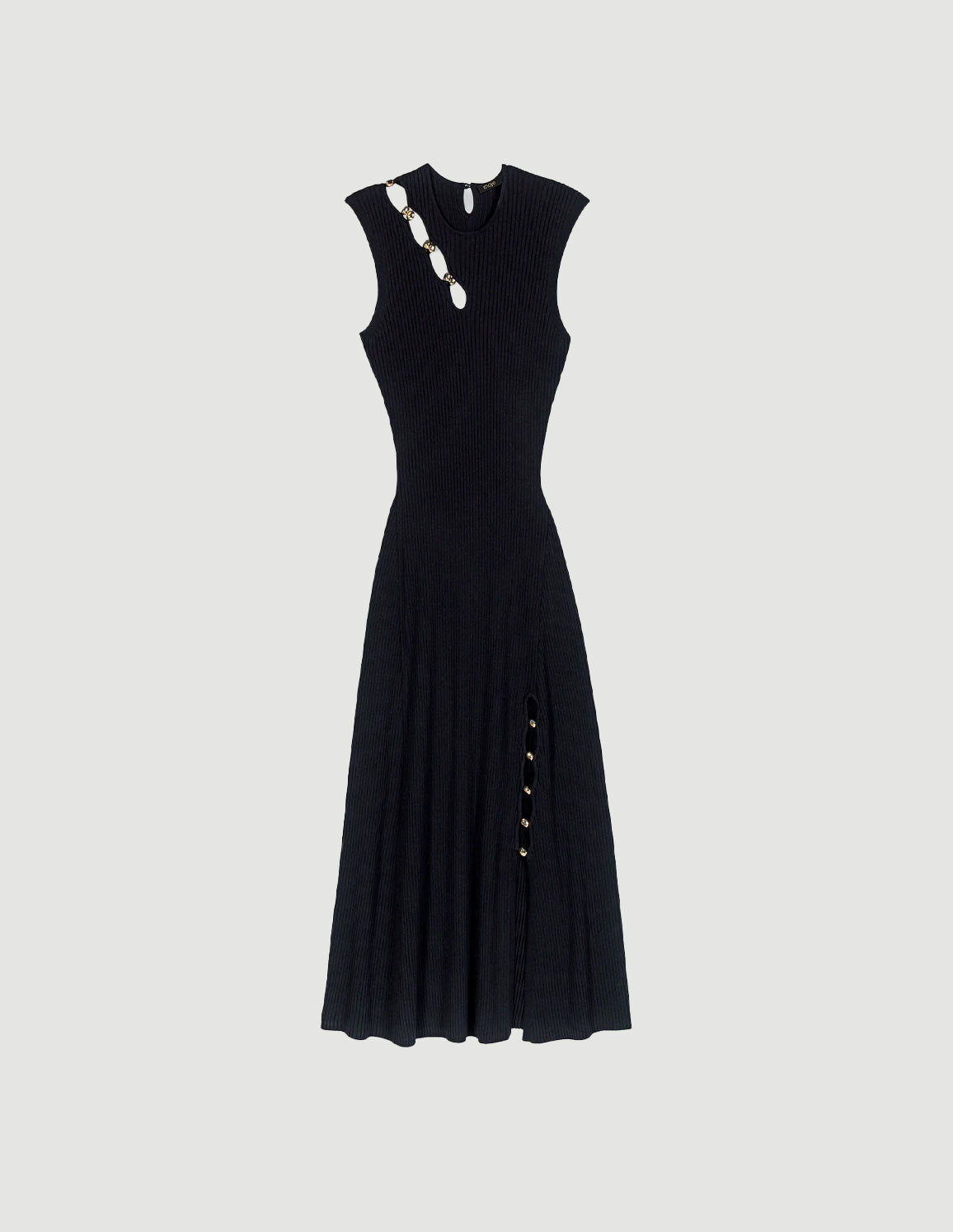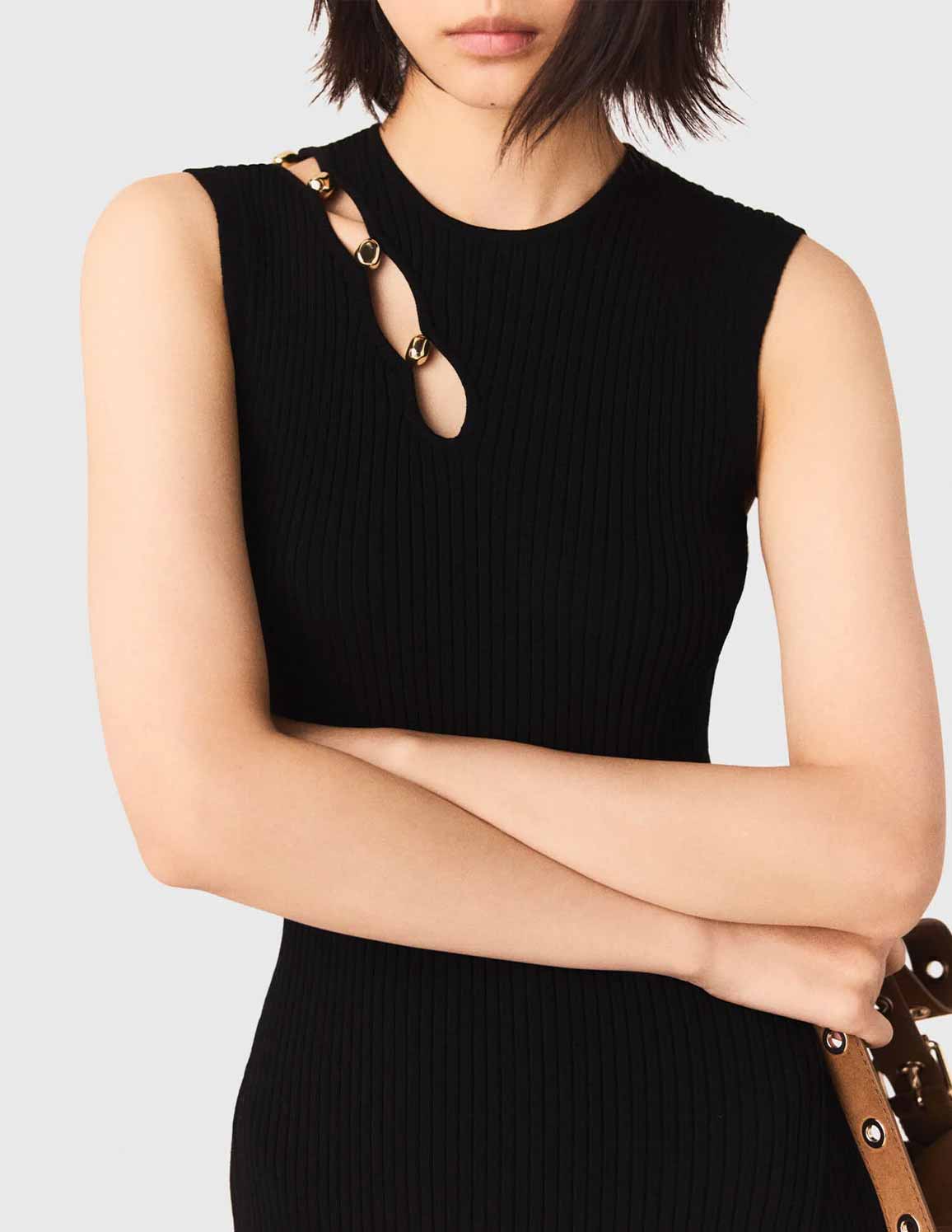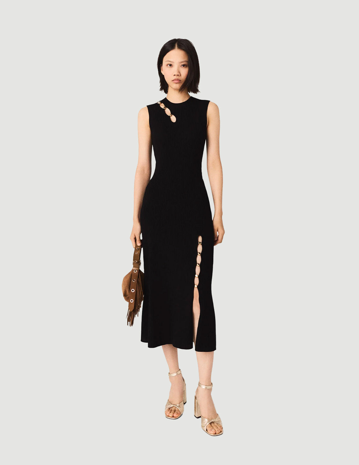 This sleeveless midi dress, with its interplay of asymmetrical cut-outs accentuated by gold-tone metal hardware, elegantly hugs the figure while subtly revealing glimpses of skin.
