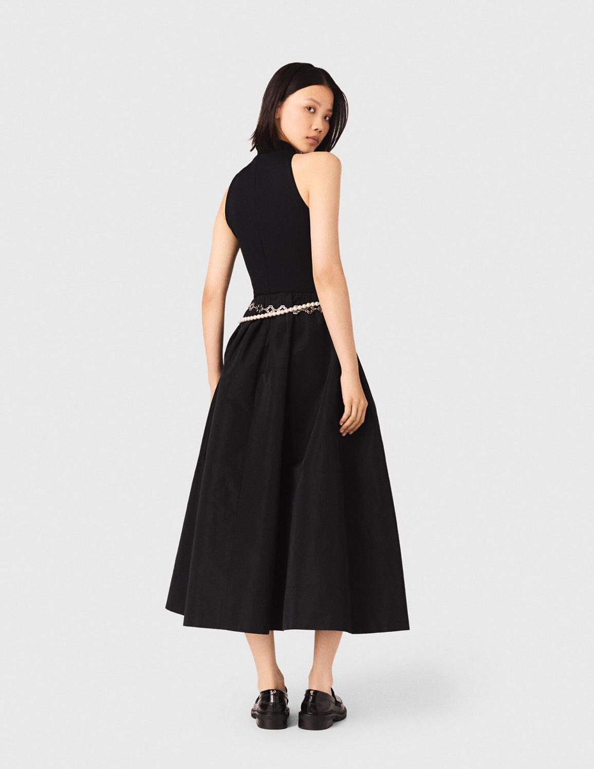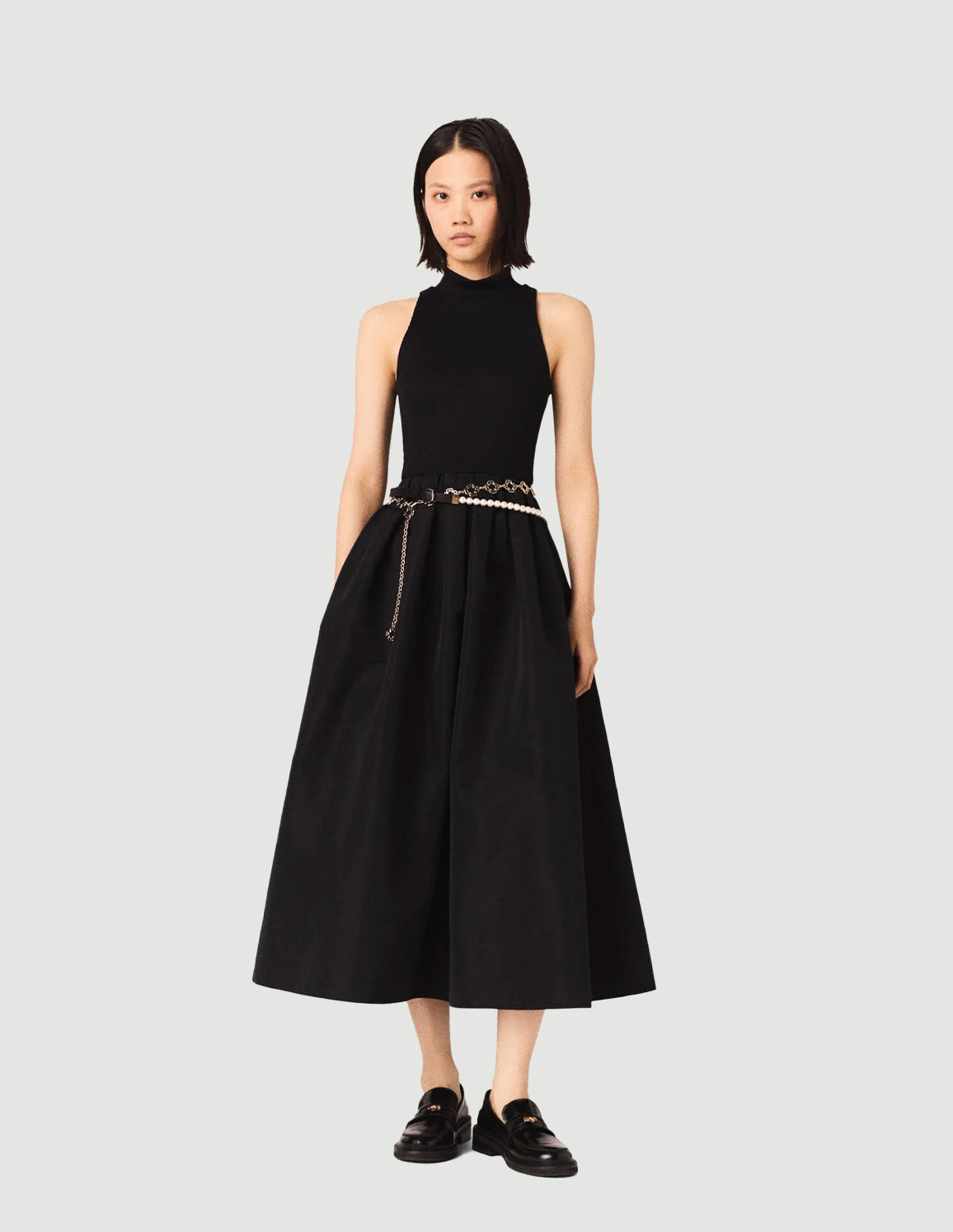 • Back in the city, with a confident look: this black dress reinvents metropolitan chic with its interplay of contrasting textures. The fitted rib knit top accentuates the silhouette, while the voluminous skirt in a smooth fabric catches the light and creates a full, flowing movement. A graphic funnel neck, exposed armholes and integrated pockets reinforce the modernity of the design; every detail expresses a structured yet fluid elegance. Elevate it with a jewelled belt and loafers with a gold-tone horsebit for a sophisticated signature.