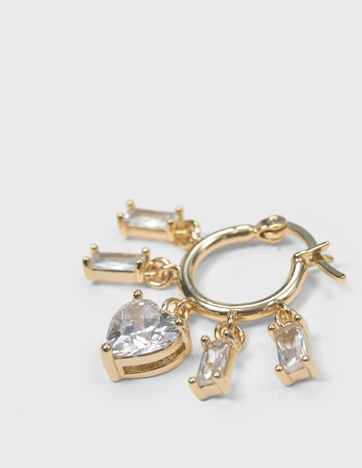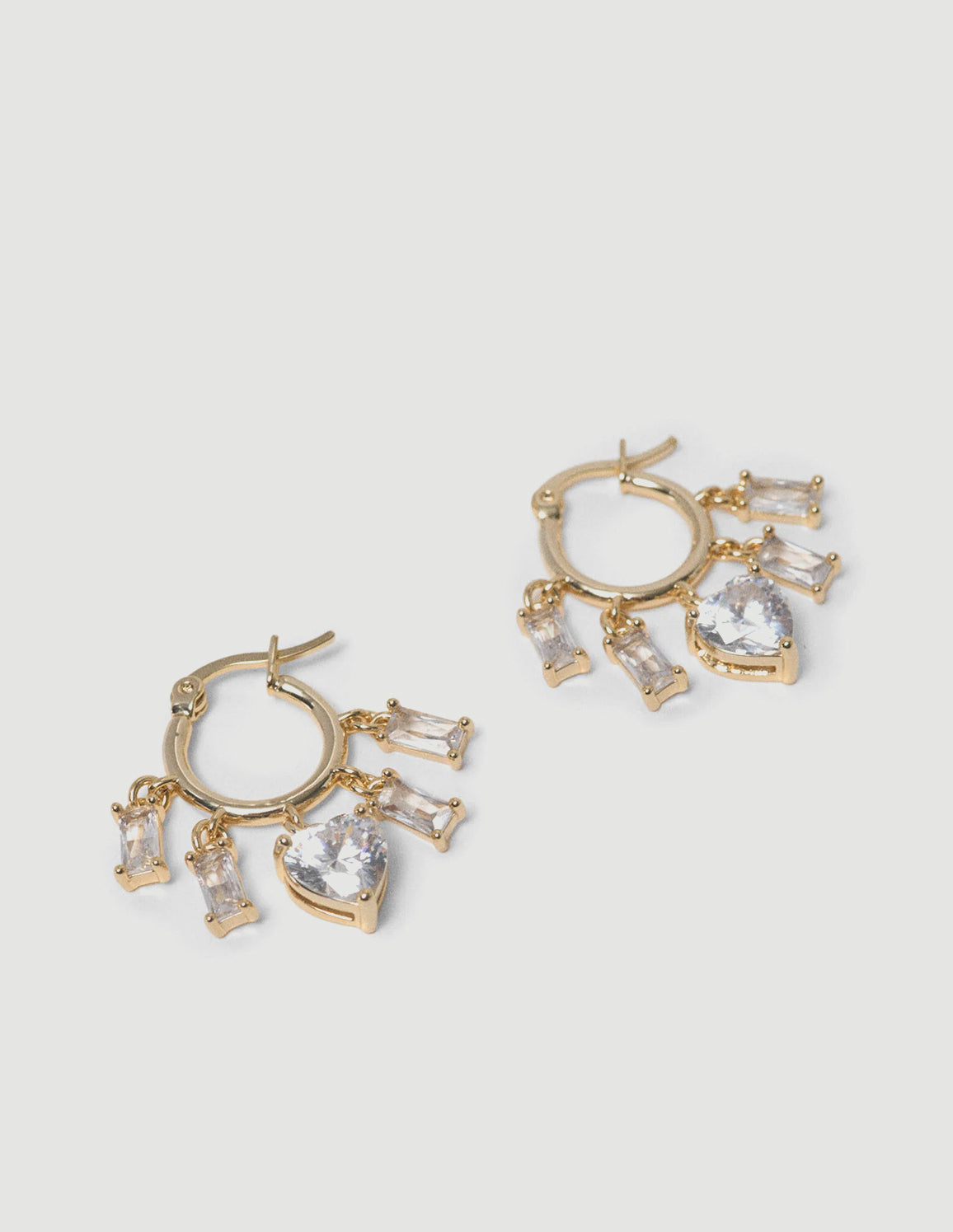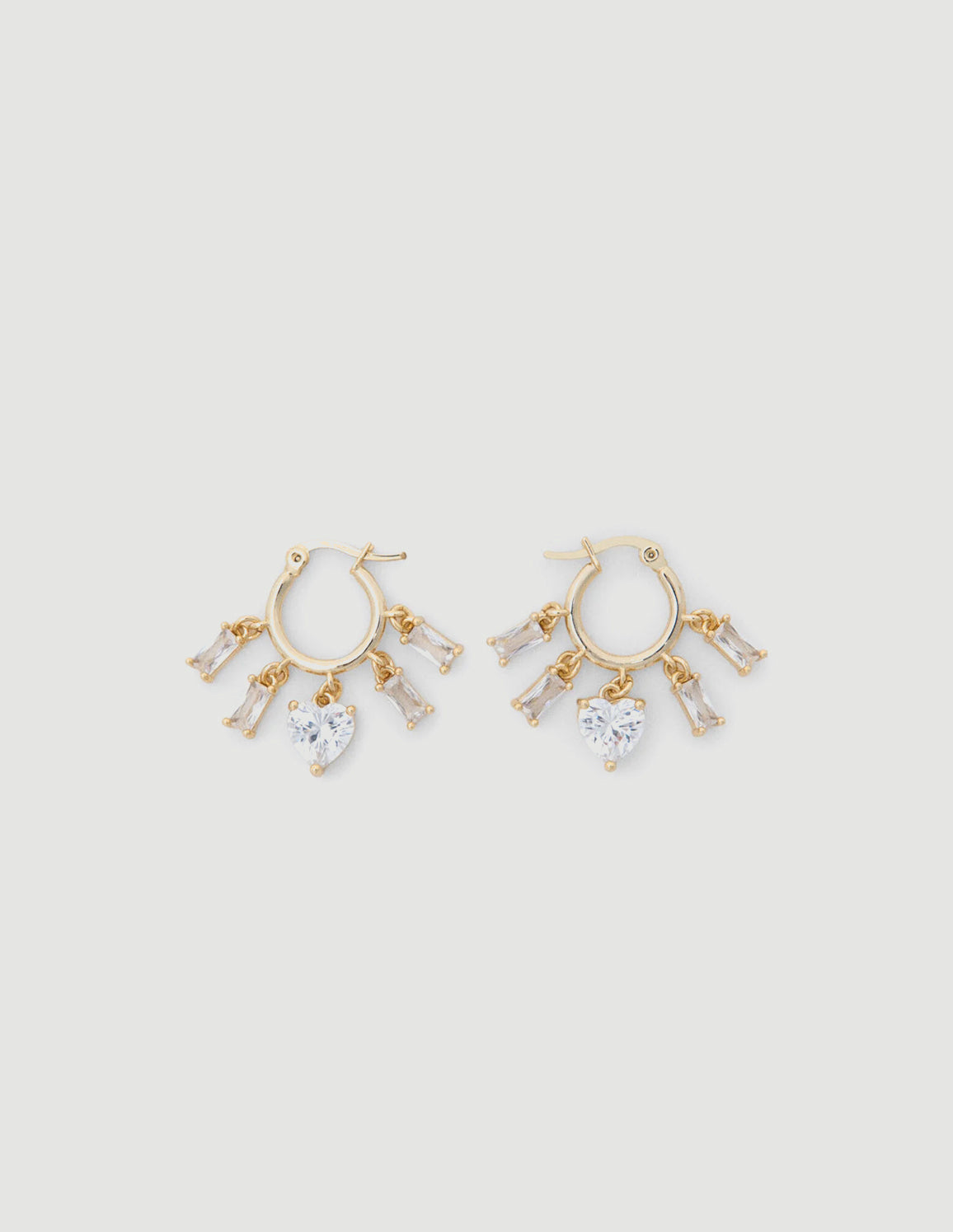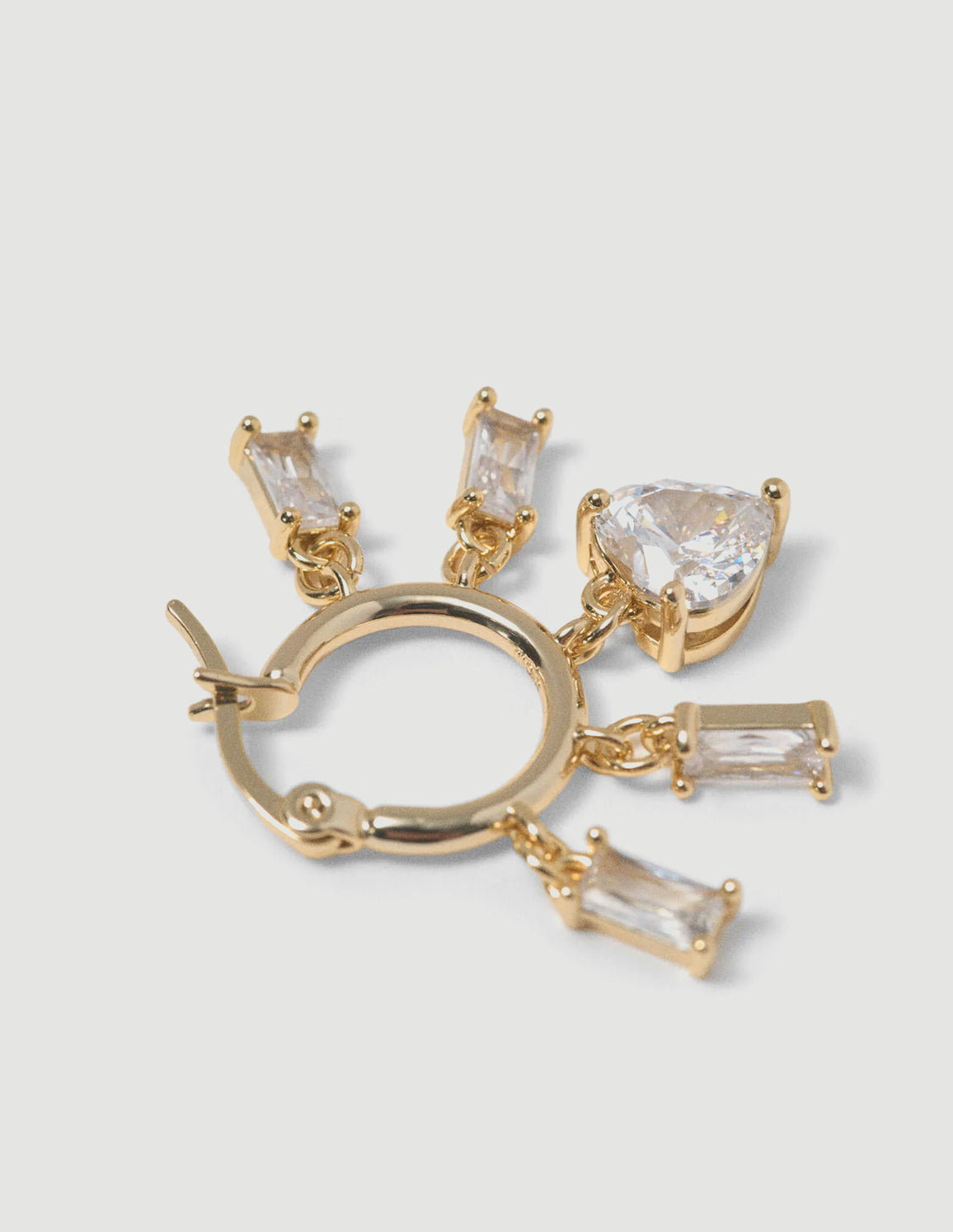 Each hoop stands out with its moving charms, revealing a central heart-shaped stone surrounded by sparkling baguette-cut stones, all precisely set on a gleaming mount. The contrasting textures and play of movement elevate this piece of jewellery into a signature accessory, perfect for illuminating your looks.
