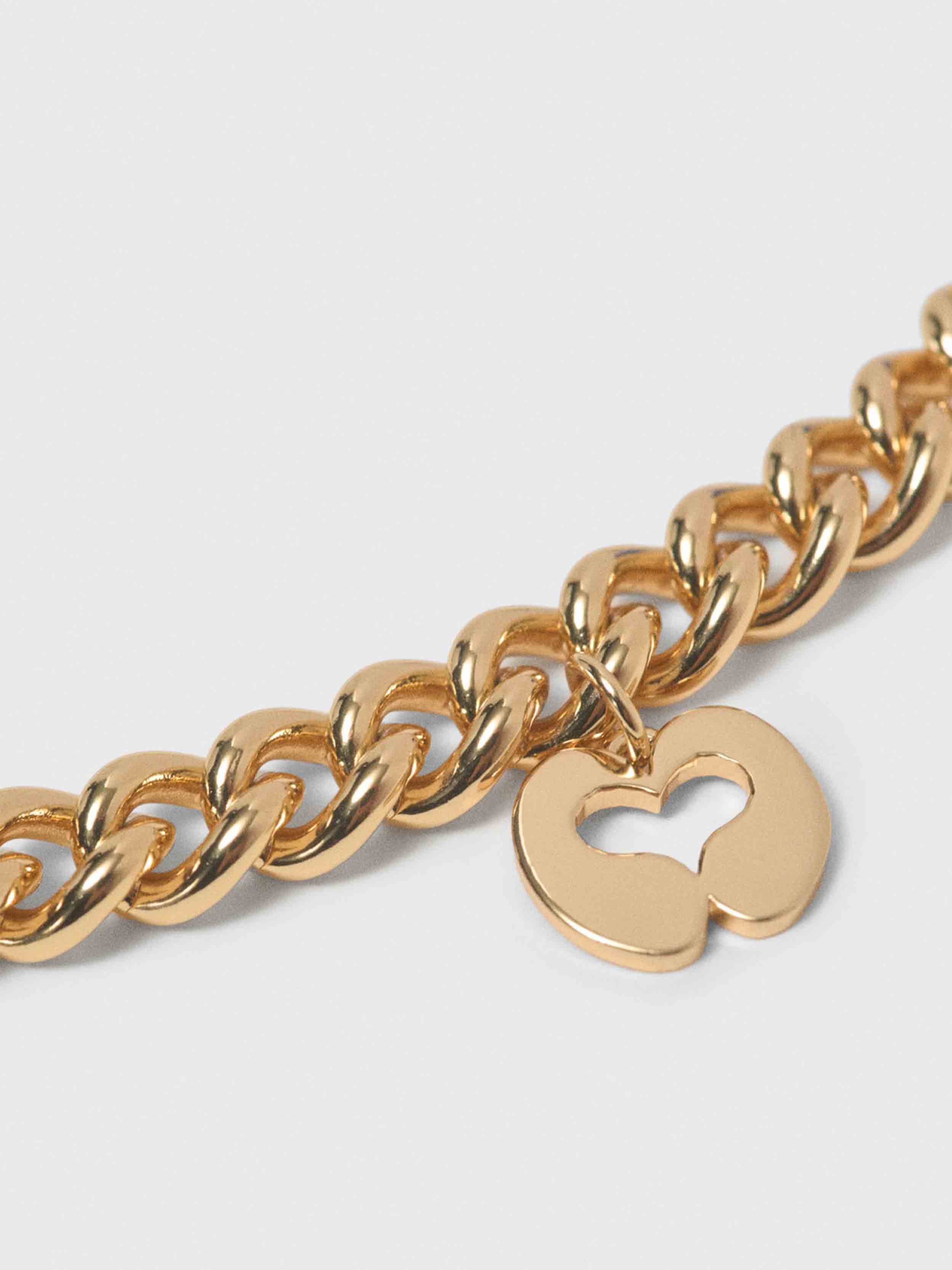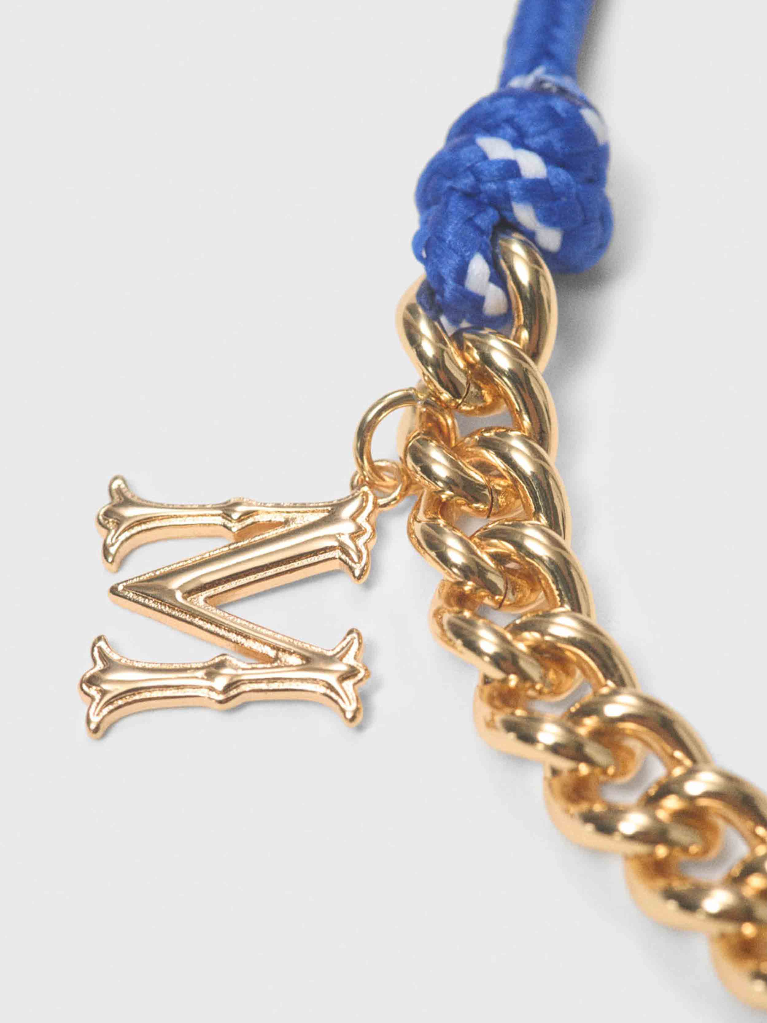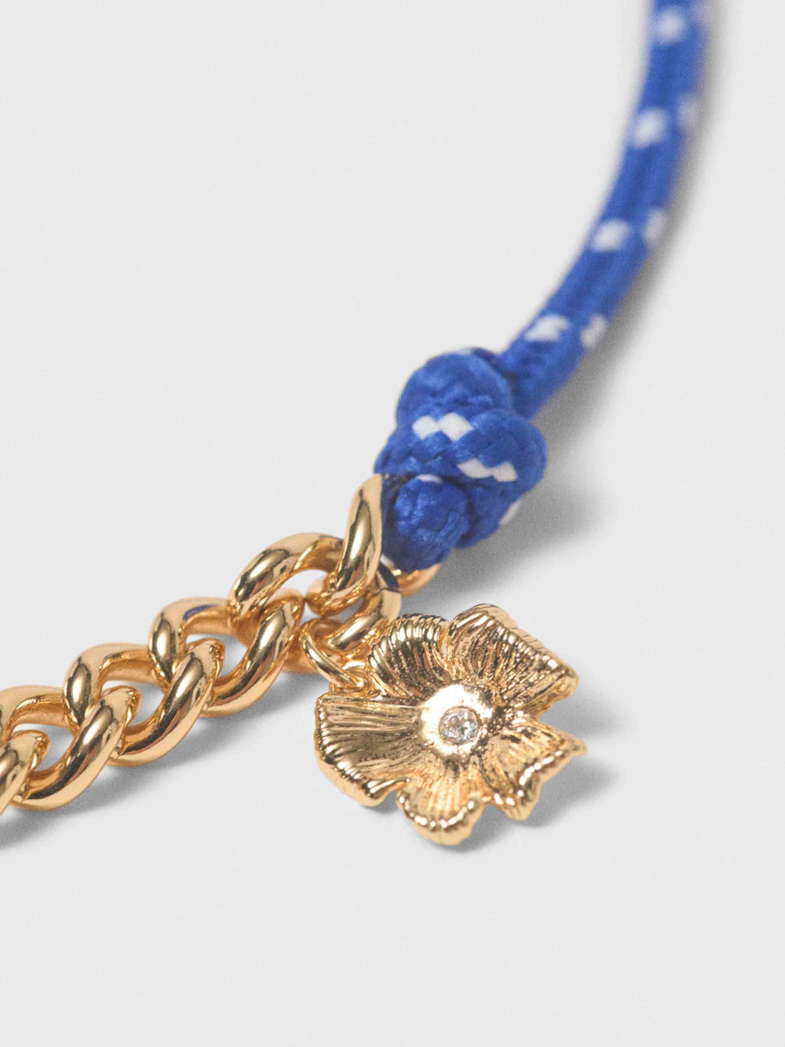 This necklace is structured around a combination of a radiant gold curb chain and an intense blue braided cord, enhanced with emblematic charms: a stylised M, the Eiffel Tower, graphic hearts and a flower set with a sparkling stone. The piece is finished with precious details and a Maje-branded clasp for a modern, personalised look.