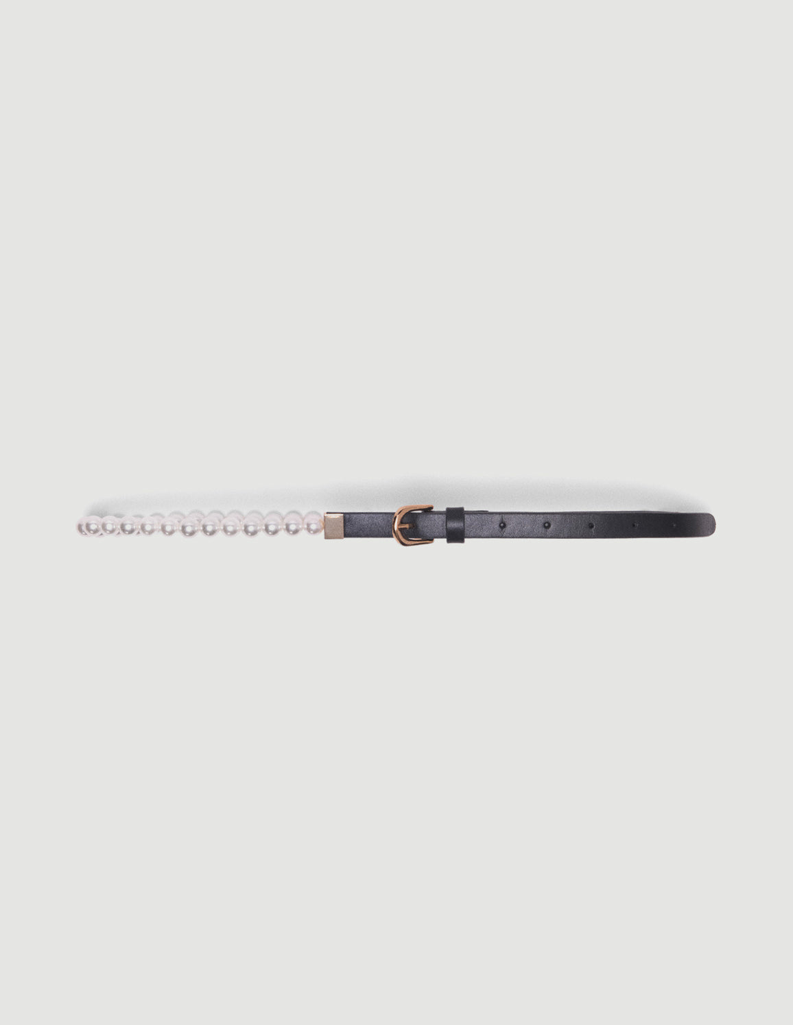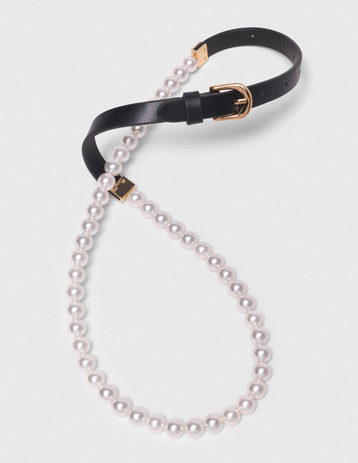 Slim and sophisticated, this belt combines the subtle grain of black leather with the iridescent shine of a pearl chain, punctuated by a graphic gold-tone buckle to define the waist with sparkle.
