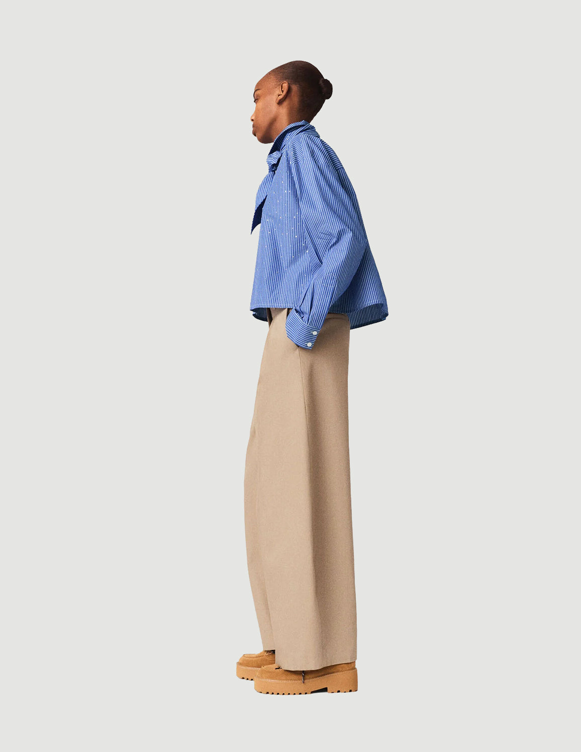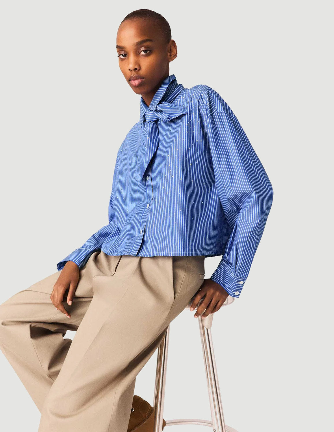 • This cropped shirt has a boxy cut, with clean stripes brought to life by a shower of sparkling rhinestones and a removable tie-neck to vary the styling. The mother-of-pearl buttons and cotton fabric add a natural and refined touch.