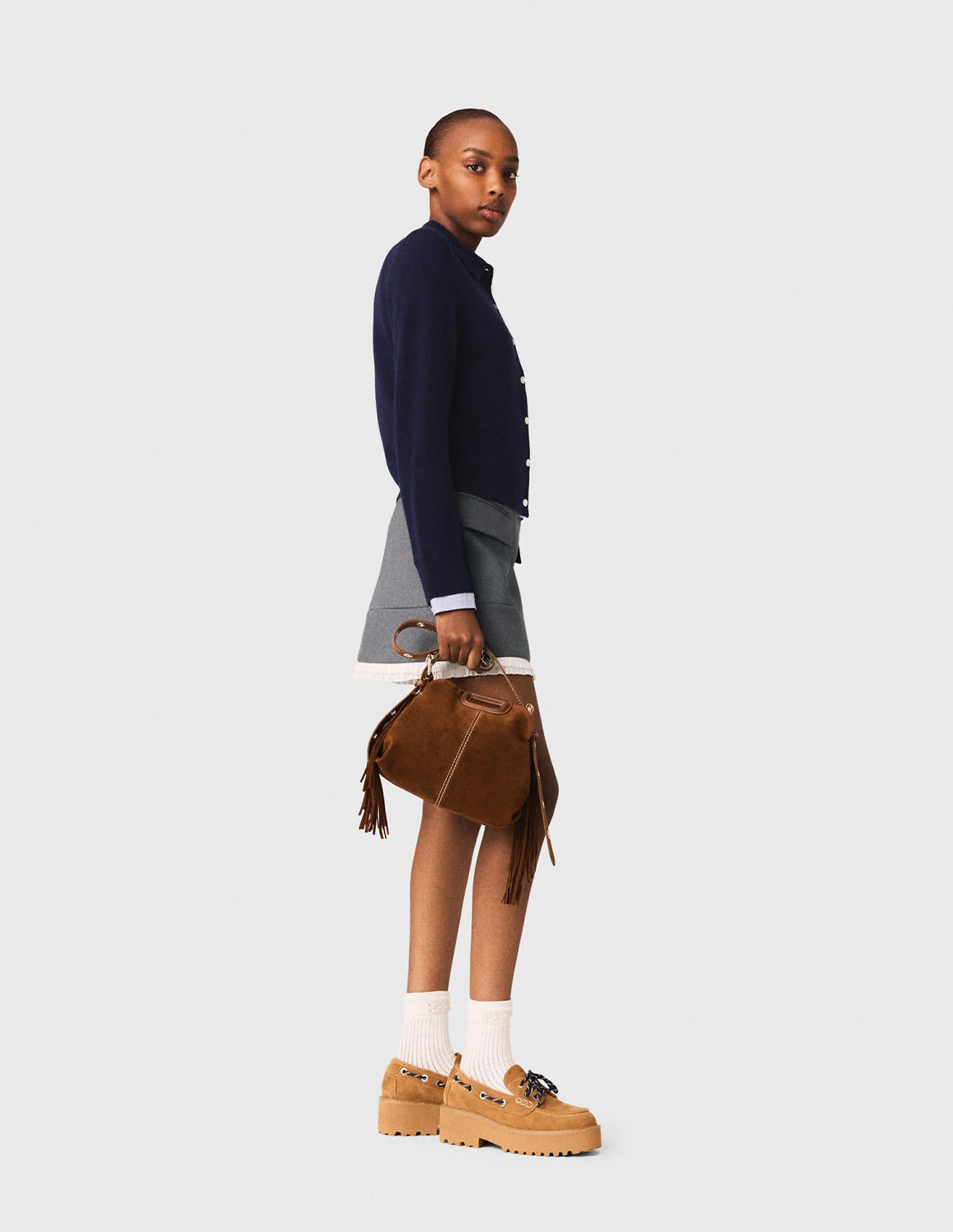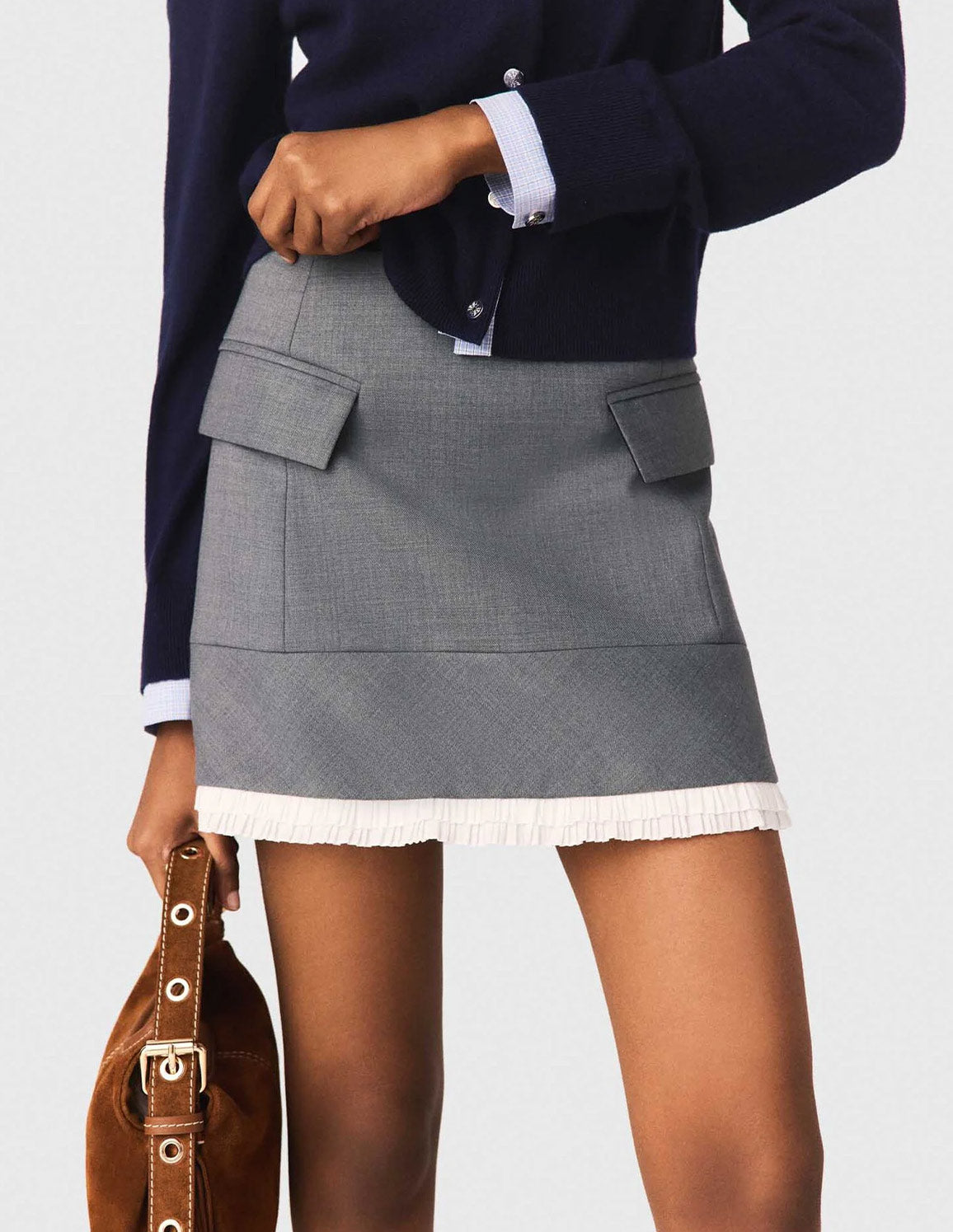 • Wear it with a polo cardigan with gingham details, a mini Miss M bag and suede boat shoes paired with high socks for a preppy look.