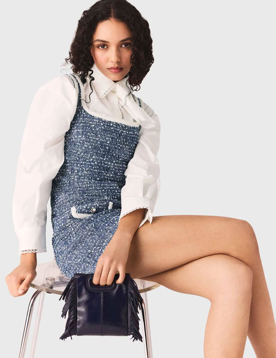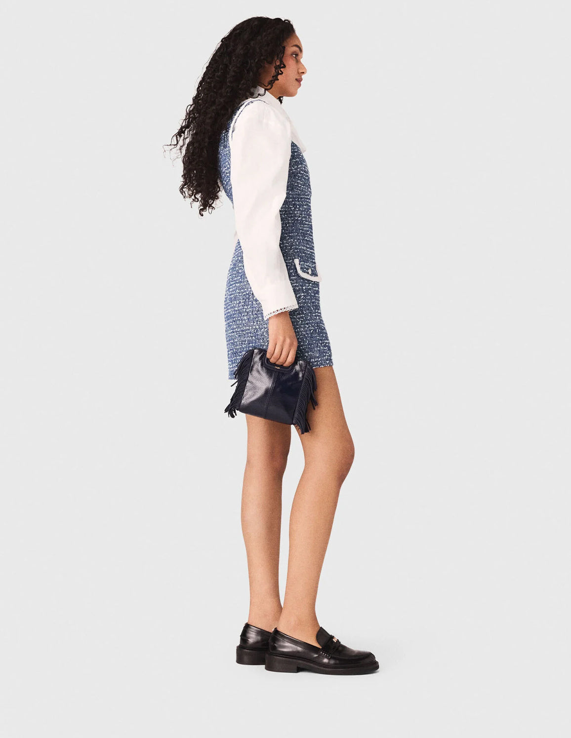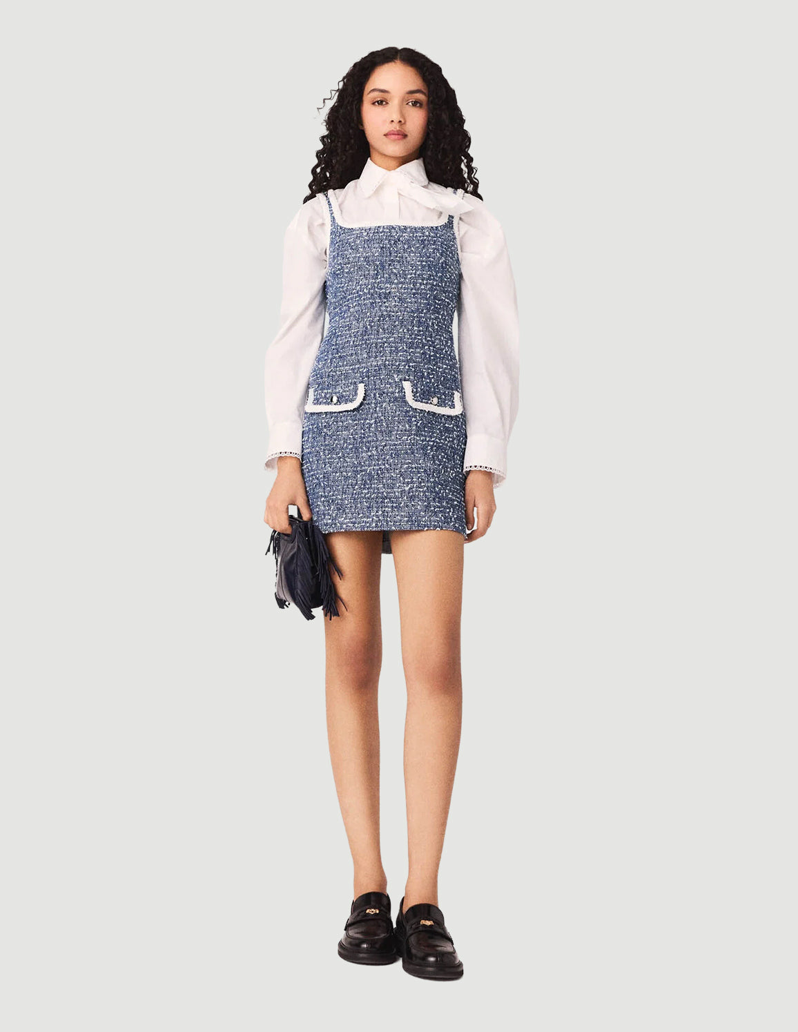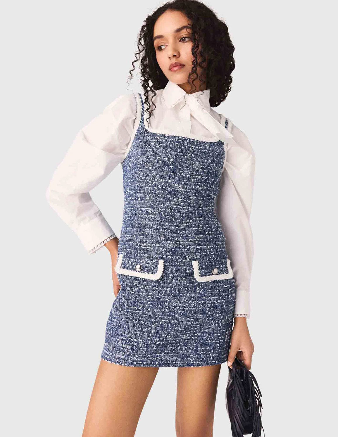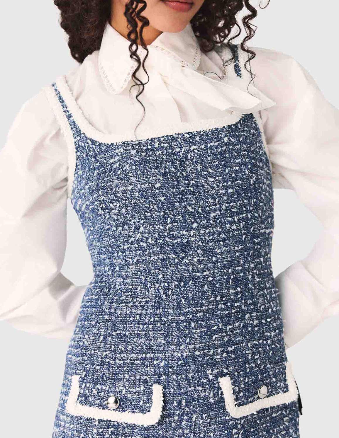 • This short dress, made from marled blue cotton tweed, features a straight, fitted cut, a square neckline and contrasting trim that accentuates every line. Two patch pockets, adorned with round silver-tone buttons, add a couture touch. The white lining and wide straps ensure comfort and support.