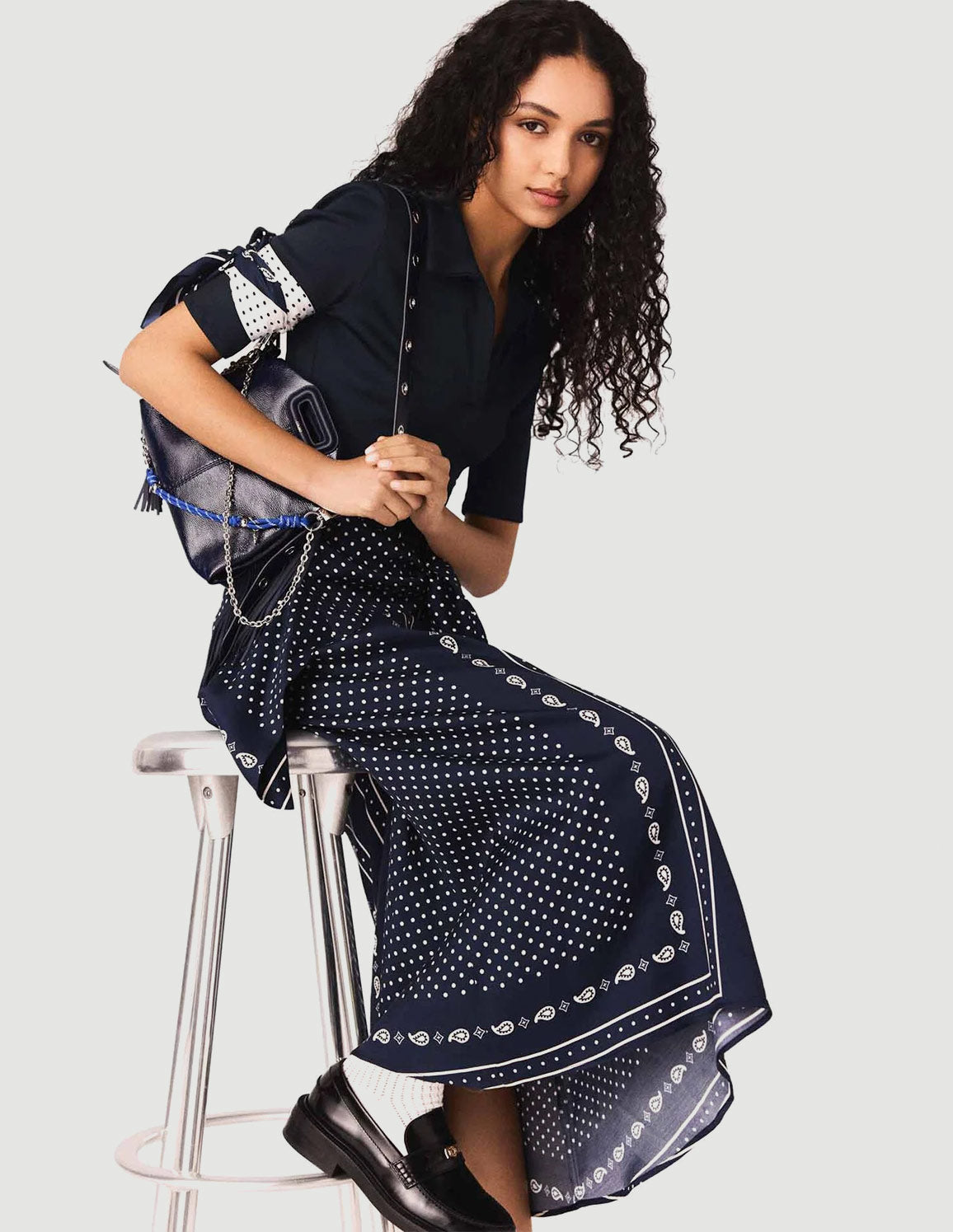 • Complete the look with an ecru scarf in the same pattern tied to the arm, a mini Miss M bag with a colourful charm for a touch of whimsy, and black loafers.