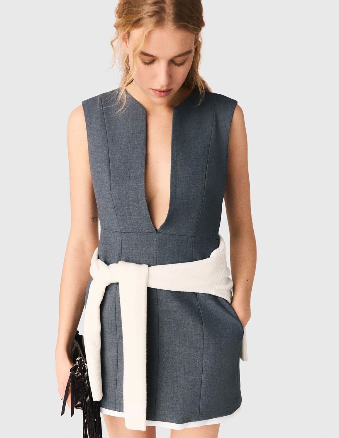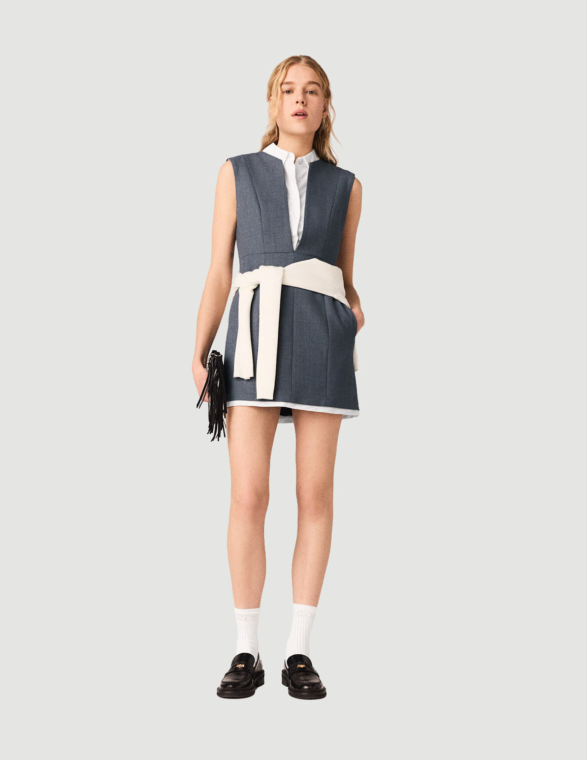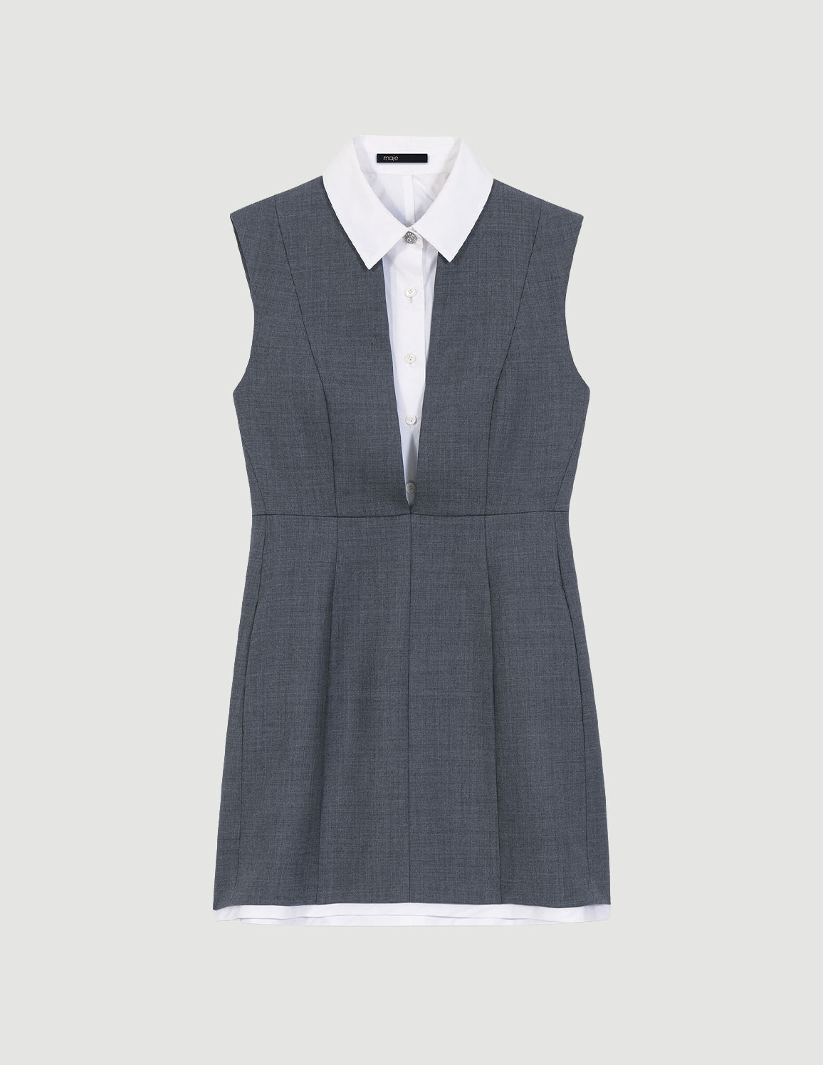 • This short tailored dress in heather grey wool features a captivating deep V-neckline, enhanced by a layered effect with a visible, detachable white poplin shirt collar. Its silver-tone zip fastening structures the silhouette. The contrasting hem reveals a visible white lining, for a graphic signature.