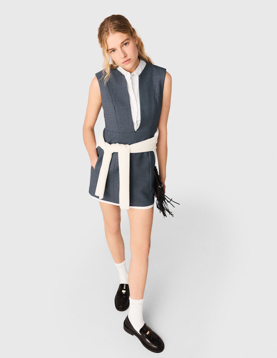 • Pair it with an ecru knit polo shirt tied at the waist, a Miss M pouch bag and black loafers for an assertive look that's a cross between tailoring and contemporary style.