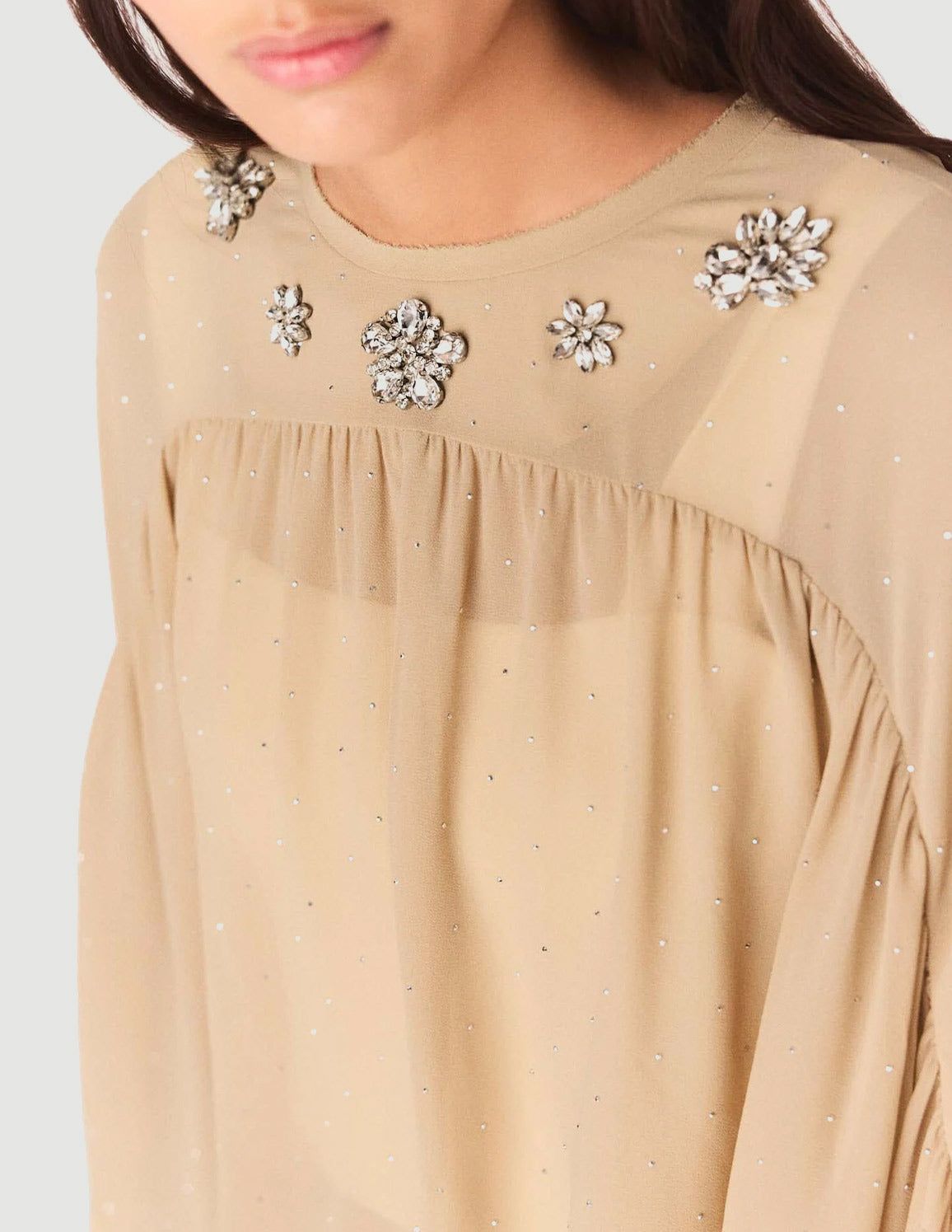 • This season is all about boldness and delicacy, where unexpected refinement meets urban energy. This floaty, sheer blouse is captivating with its loose, cape-style cut and meticulous details: a neckline illuminated with crystal flowers and a shower of silver rhinestones. The airy, luminous silhouette will make you shine, day or night.