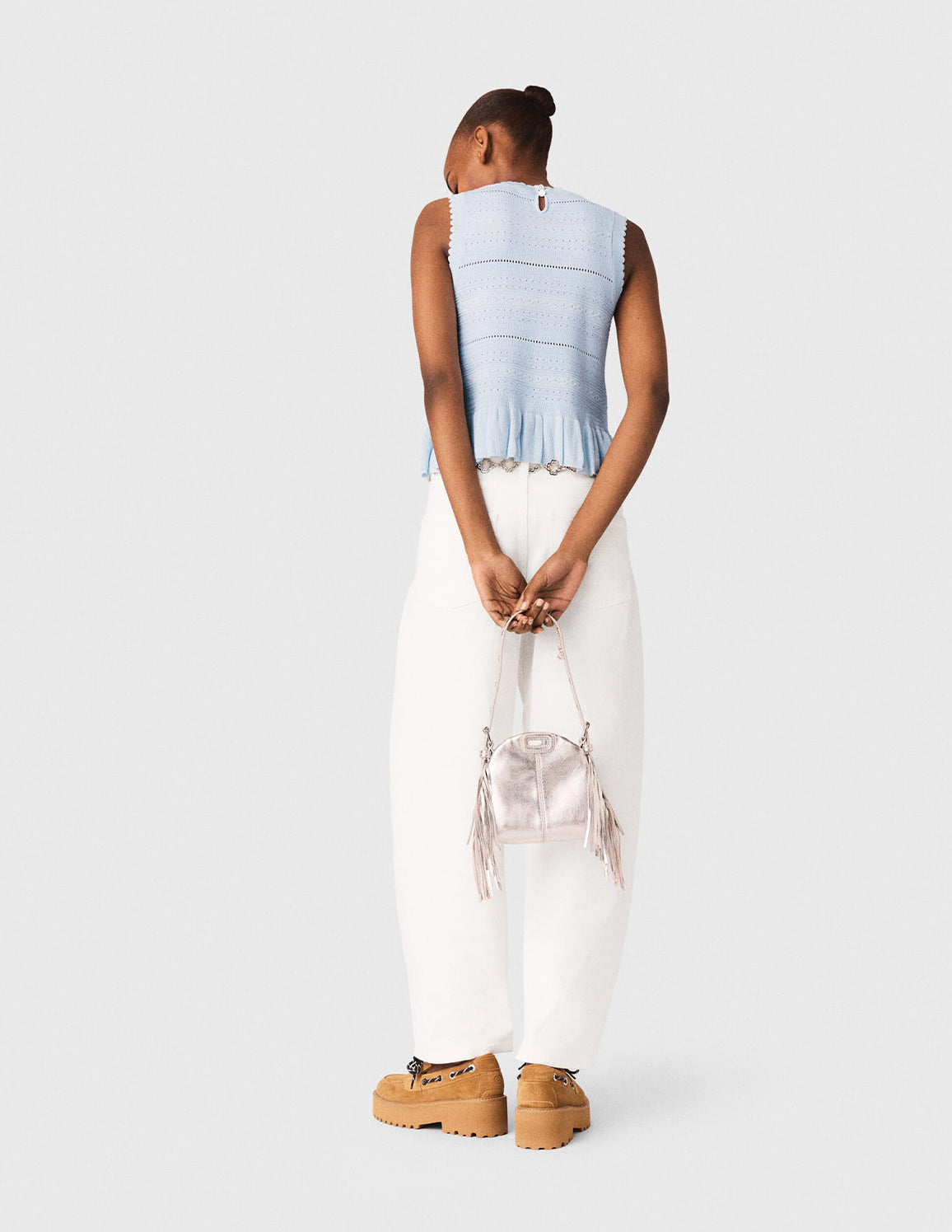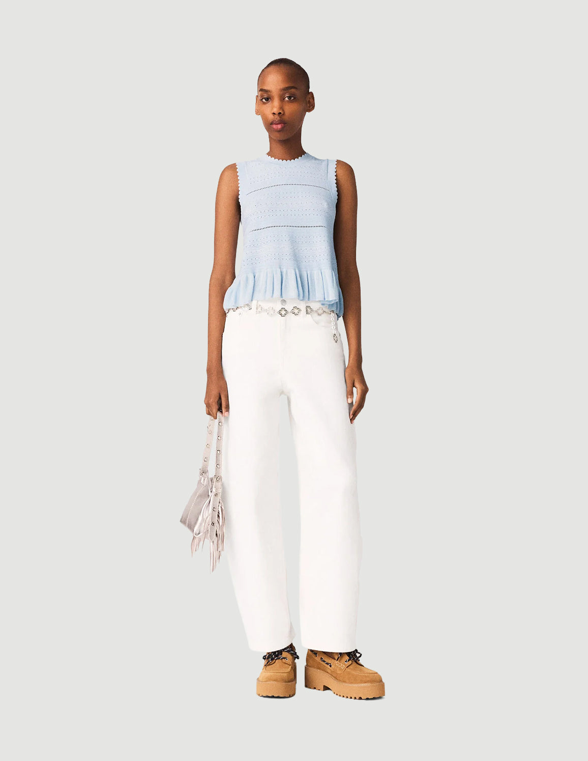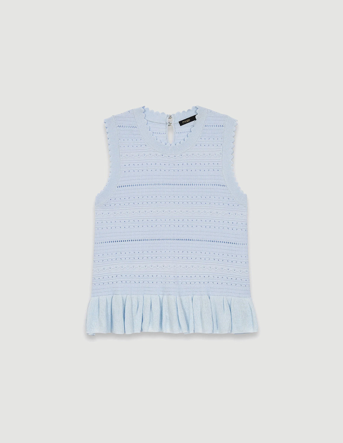 • This sky-blue openwork knit top subtly shapes the bust, while the ruffled hem and scalloped edges create a structured, feminine silhouette.