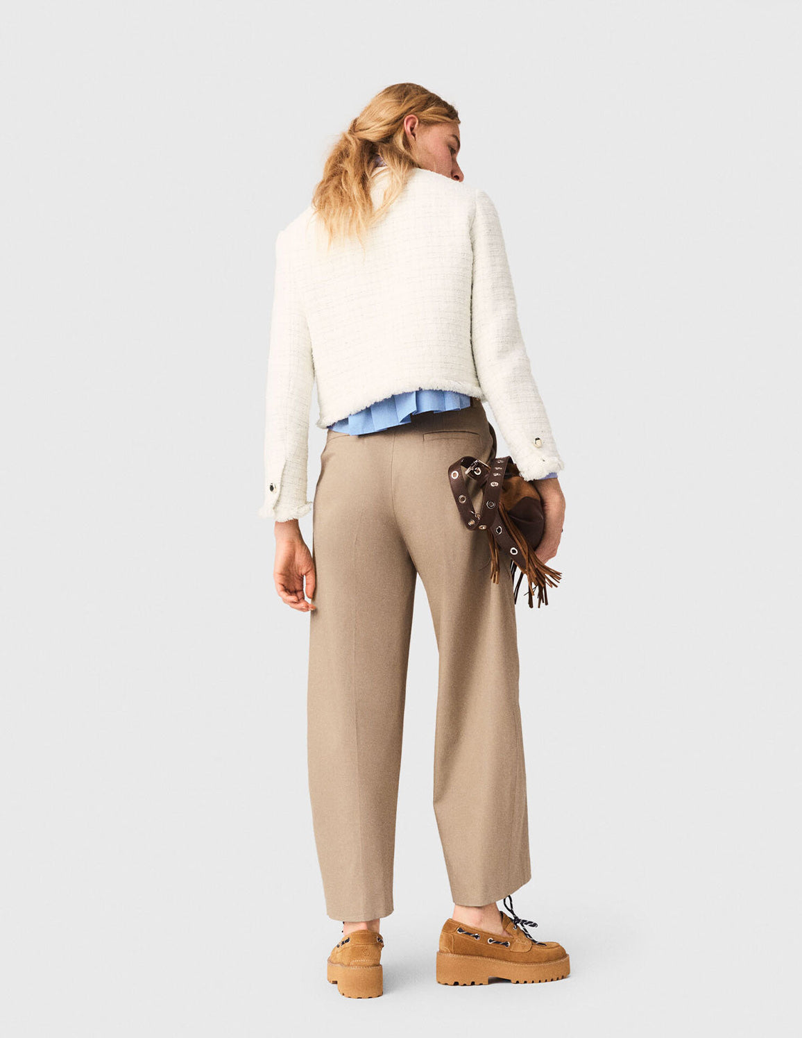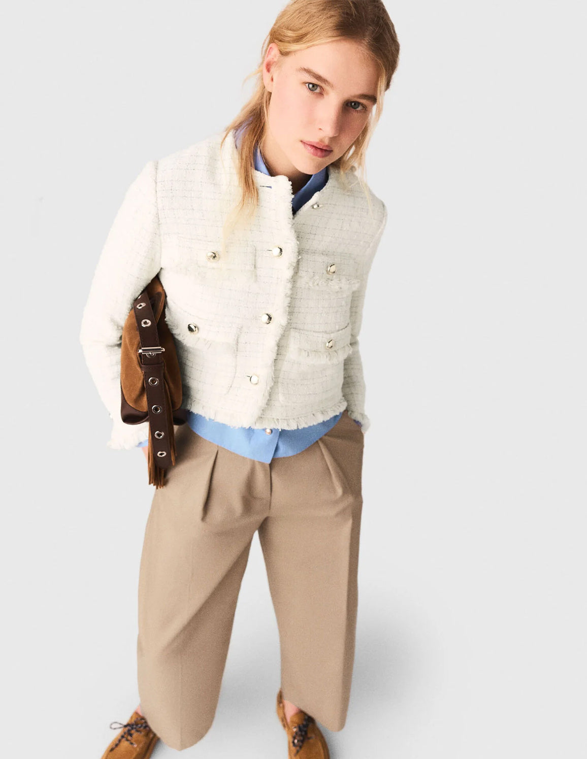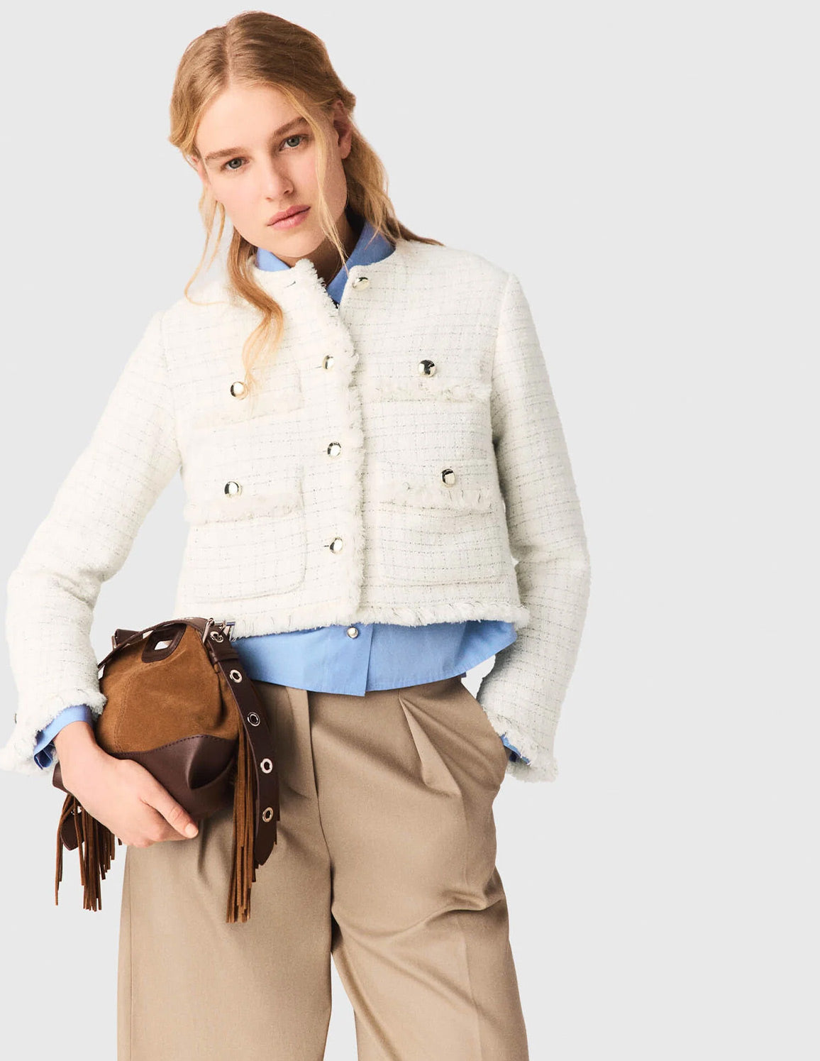 • This cropped jacket in ecru checked tweed brightens up the silhouette with its radiant gold-tone buttons. The frayed edges on the hem, chest flaps and pockets modernise this timeless essential.