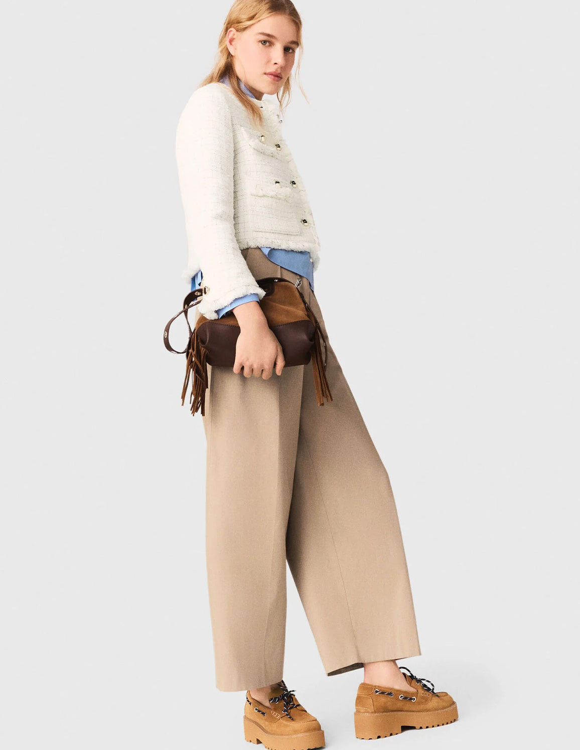 • Layer it over a blue shirt and wide-leg trousers for a chic, effortless contrast. Play with textures by adding platform boat shoes and a Miss M mini bag in suede and smooth leather.