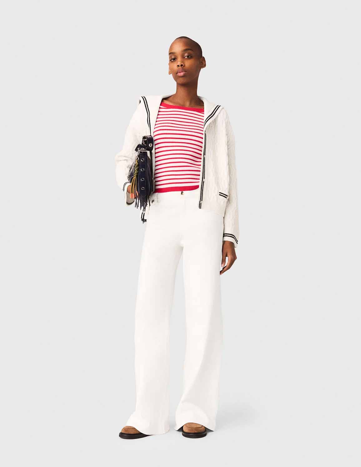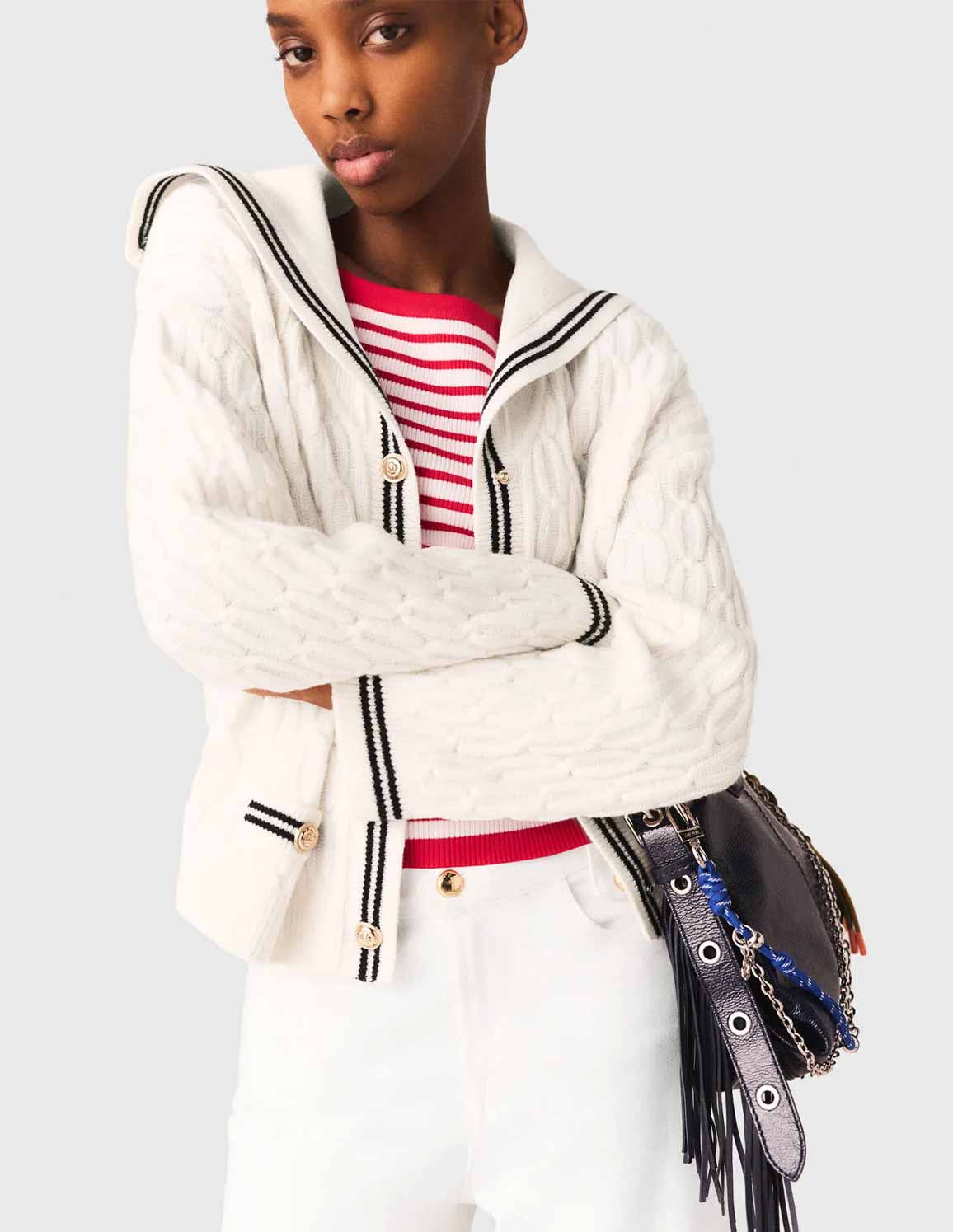 • This cardigan is inspired by Maje's take on nautical style, where bold marine codes meet Parisian sophistication and freedom of movement.