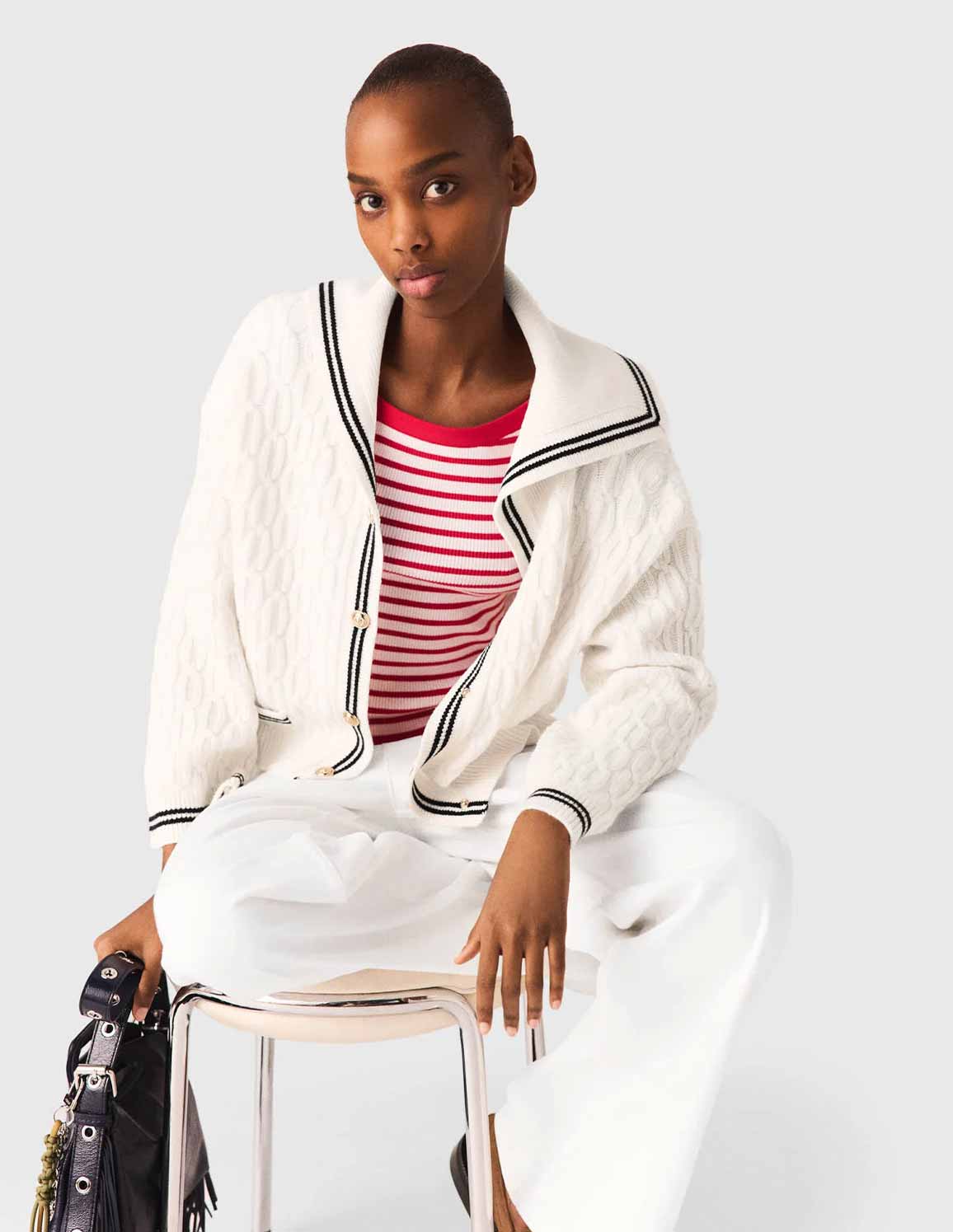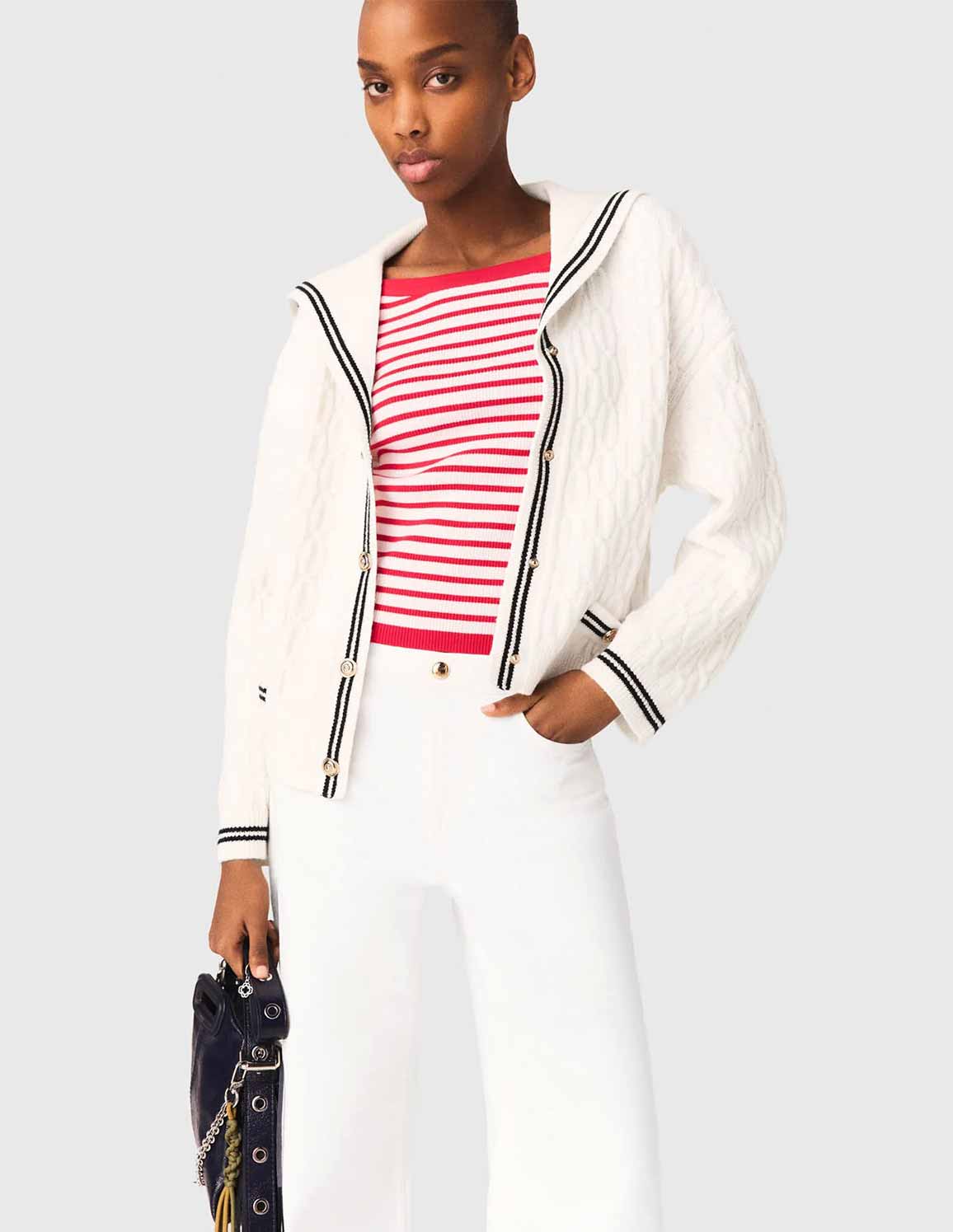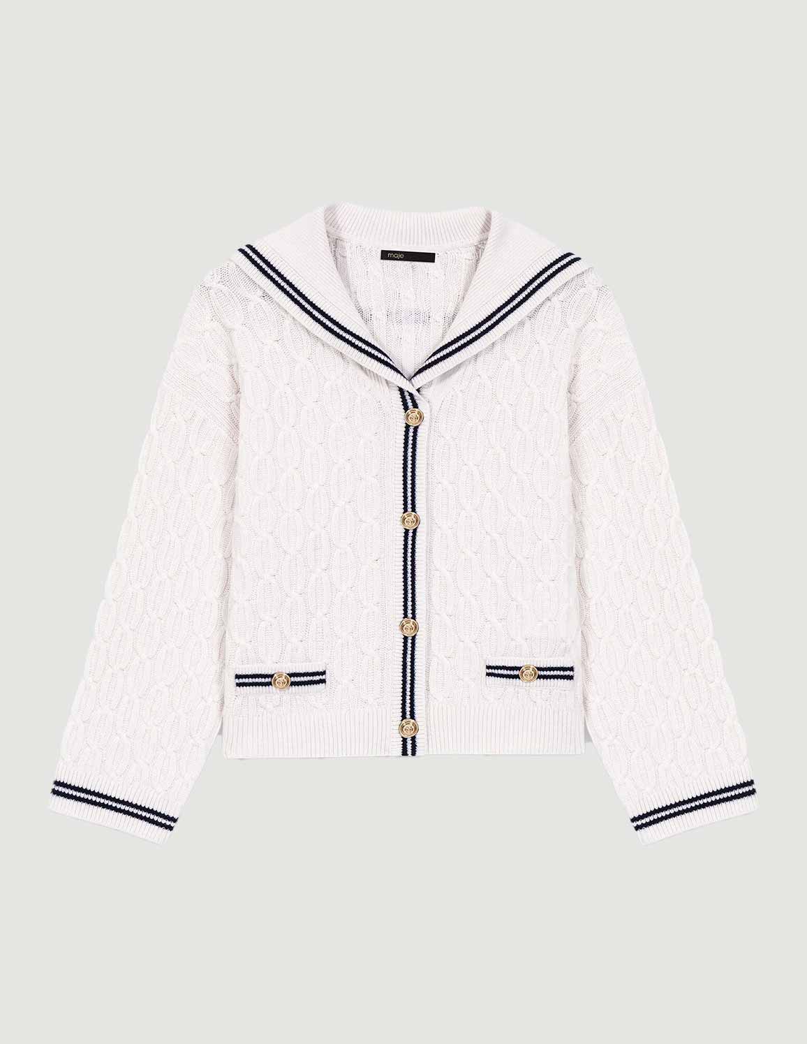 • Cable-knit cardigan with white striped boat neck
