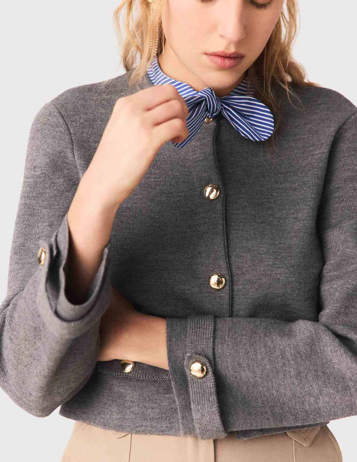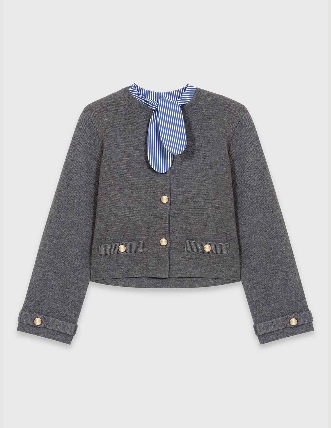 • This straight-cut, mottled grey cardigan reveals a subtly contrasting knit, punctuated by engraved gold buttons and pockets with ribbed flaps, while a removable blue and white striped collar adds a graphic and versatile touch.
