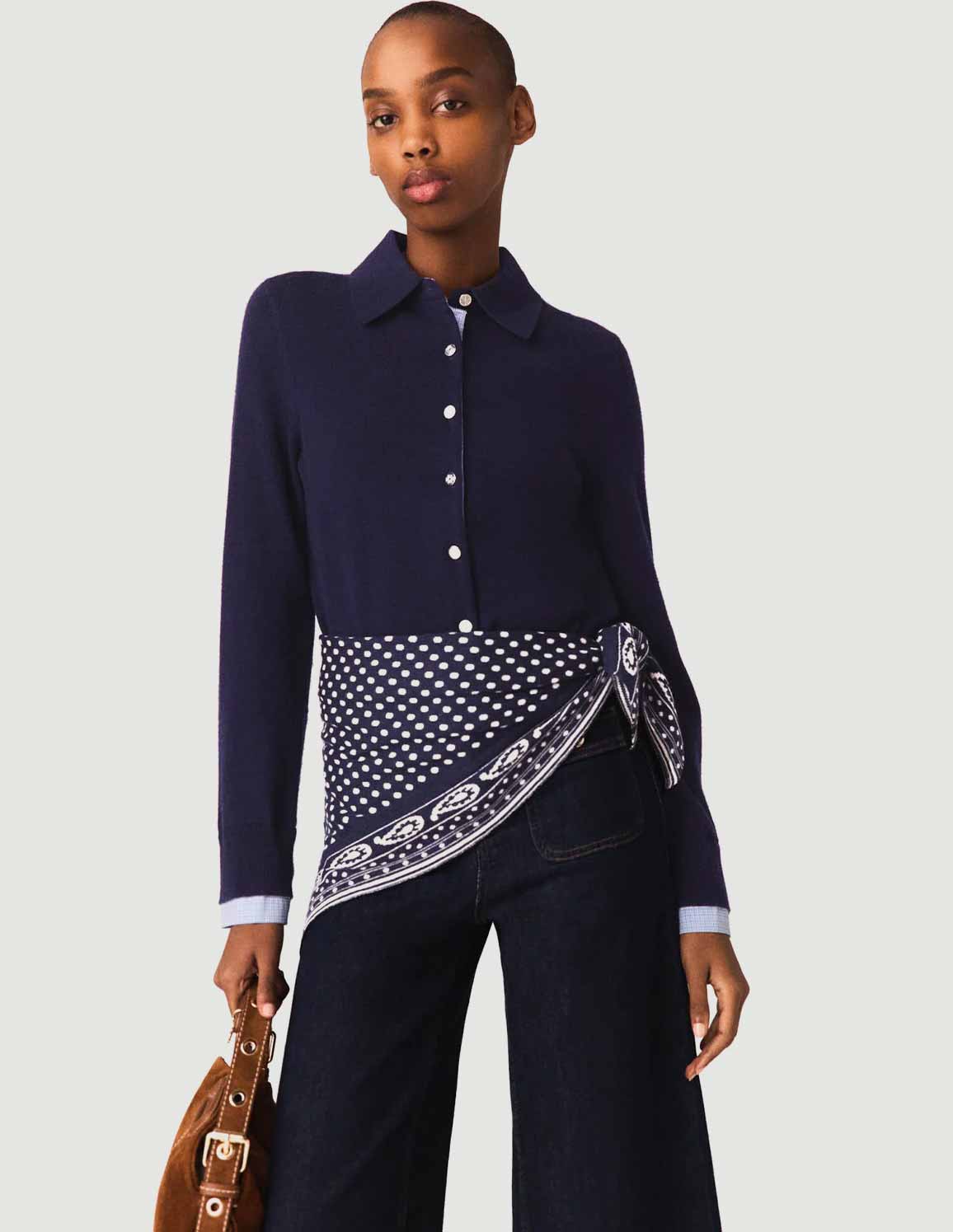 • This navy blue cardigan combines a luxurious knit with a polo collar and creates a chic layered effect with its gingham check shirt insert, subtly visible at the collar and cuffs. The silver-tone jewel buttons add a touch of sophisticated sparkle.