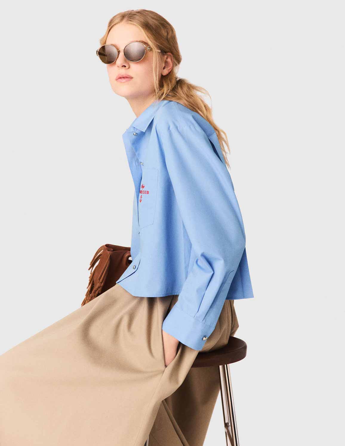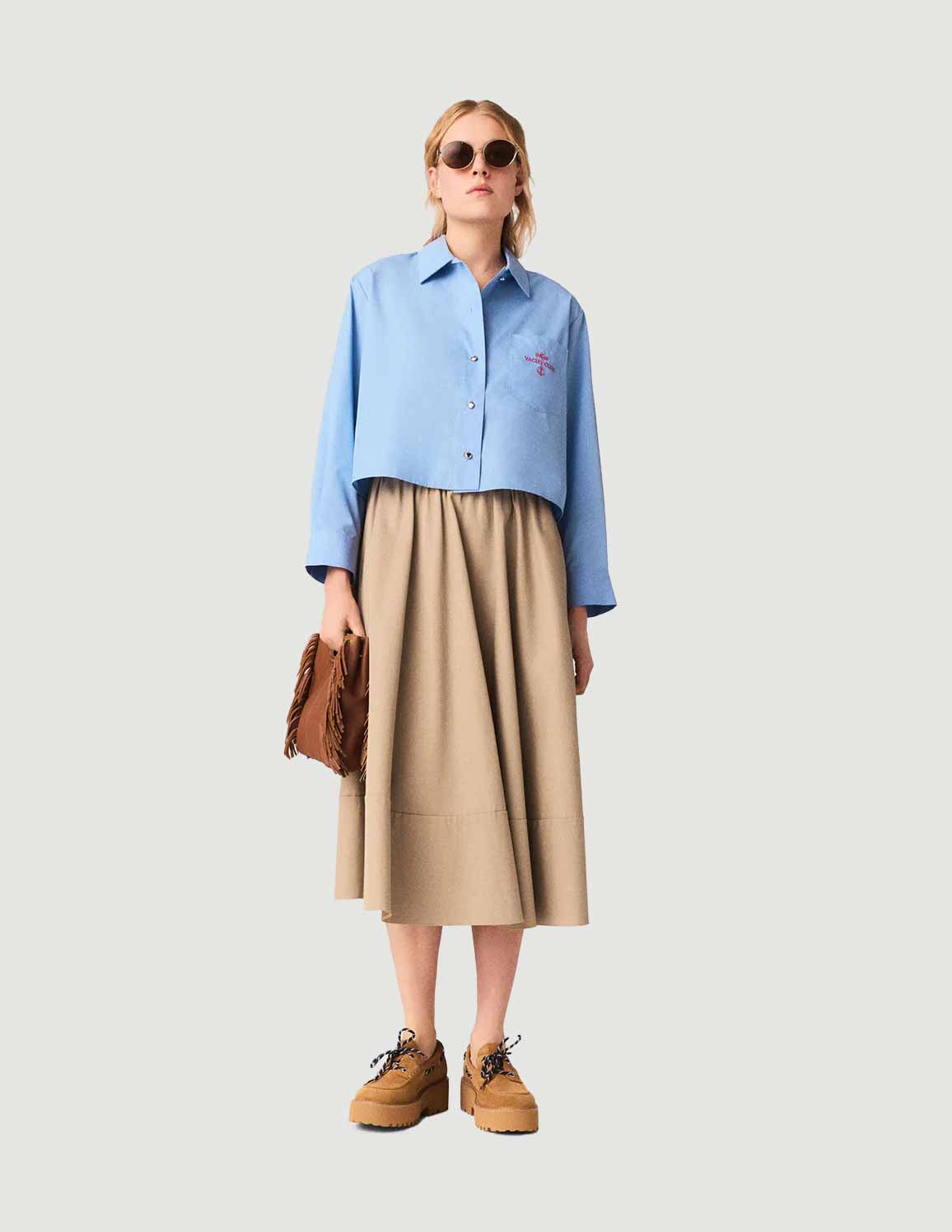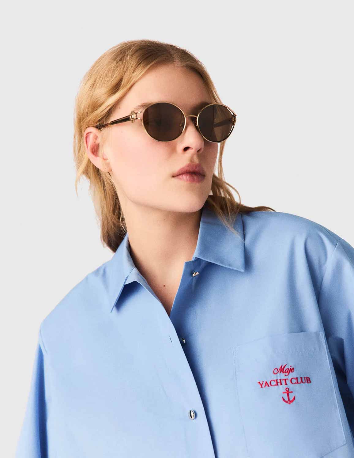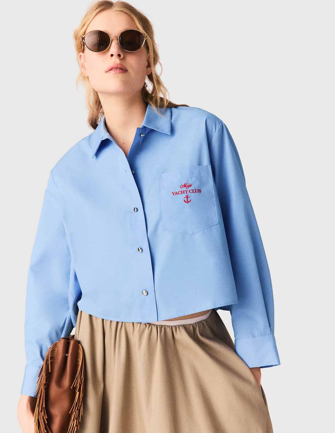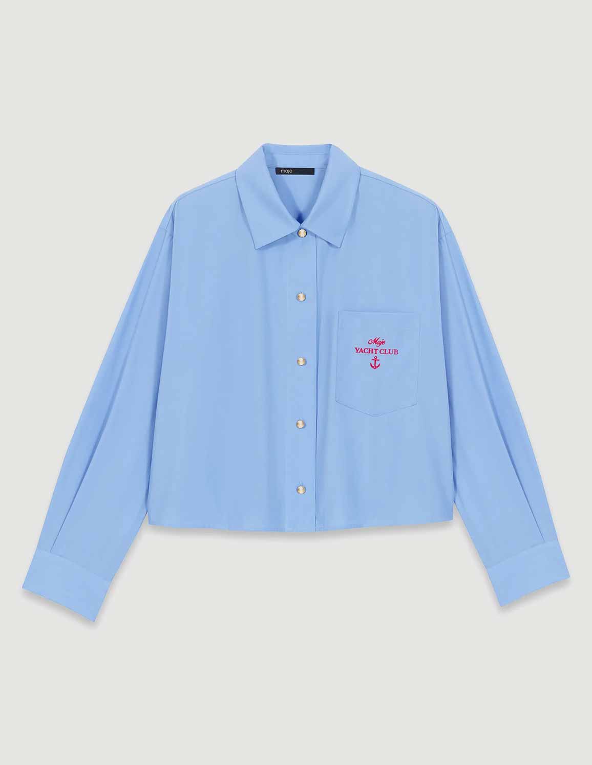 • This short, loose-fitting shirt features gold press-studs, long sleeves with dropped shoulders and a pleated back that adds movement and structure to the silhouette. A red "Maje Yacht Club" embroidery and a nautical anchor on the chest pocket add sophisticated details to the piece.