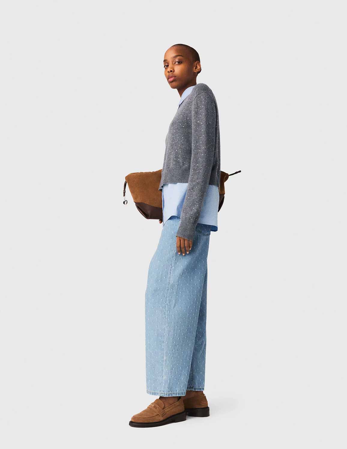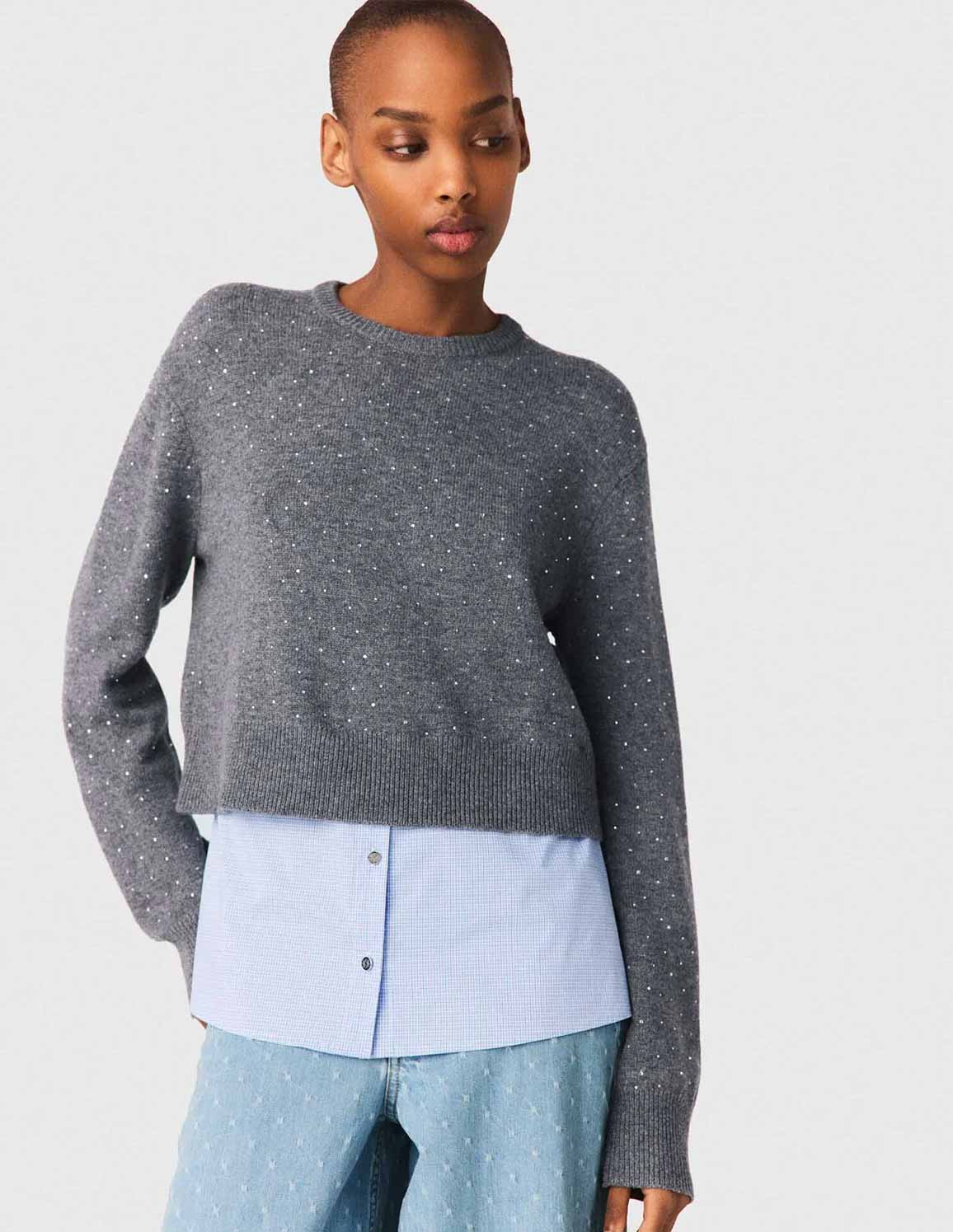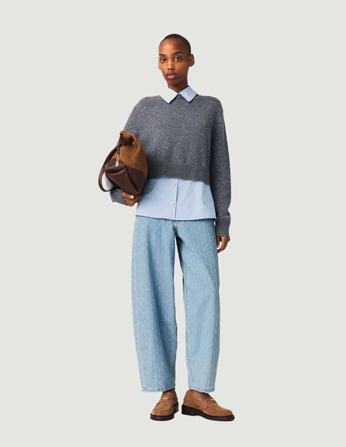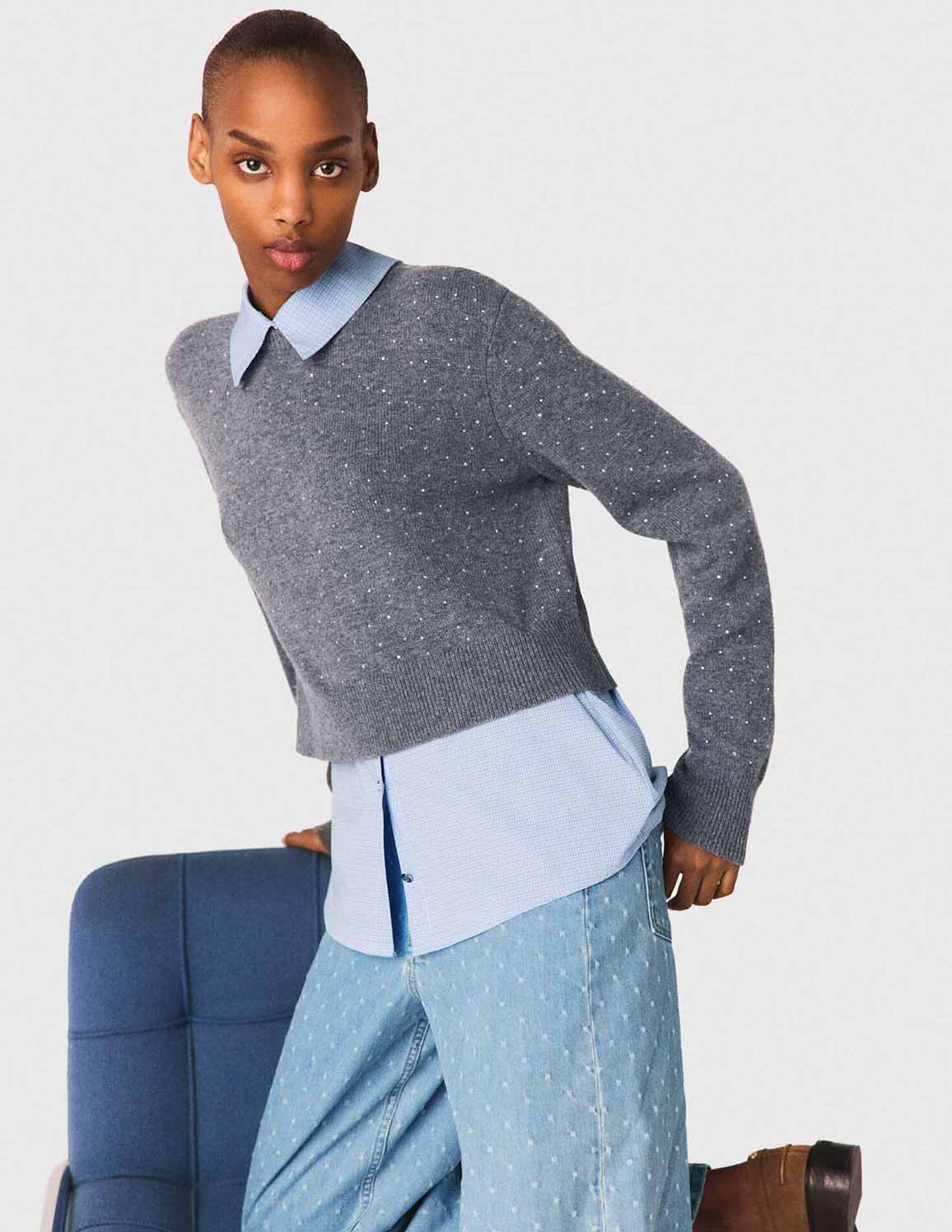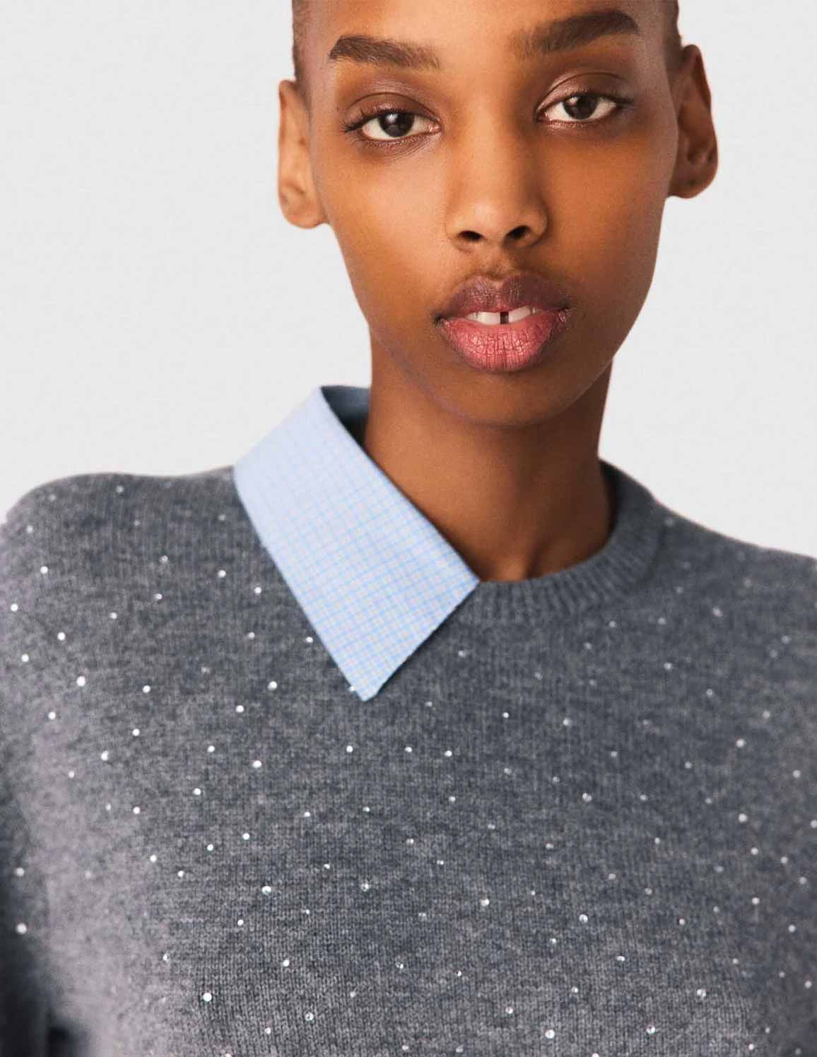 • The mottled grey wool blend jumper, scattered with bright rhinestones, reveals a structured silhouette, enhanced by the layered effect of a removable sky-blue checked poplin shirt. The cropped cut and precious knit highlight a contemporary spirit, while the ribbed trim and interplay of shine offer a graphic elegance.