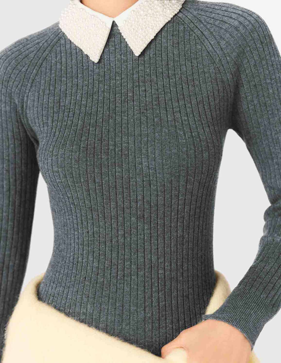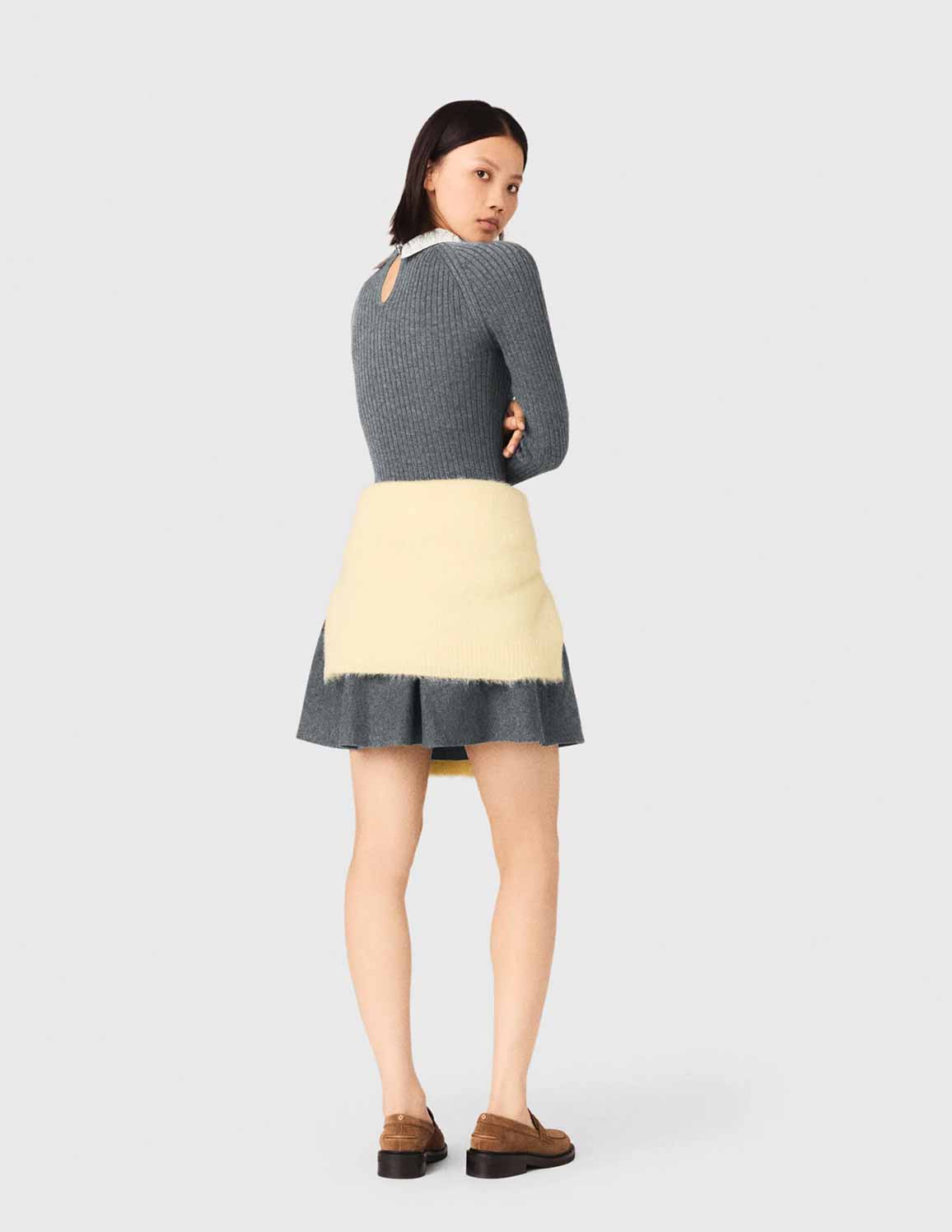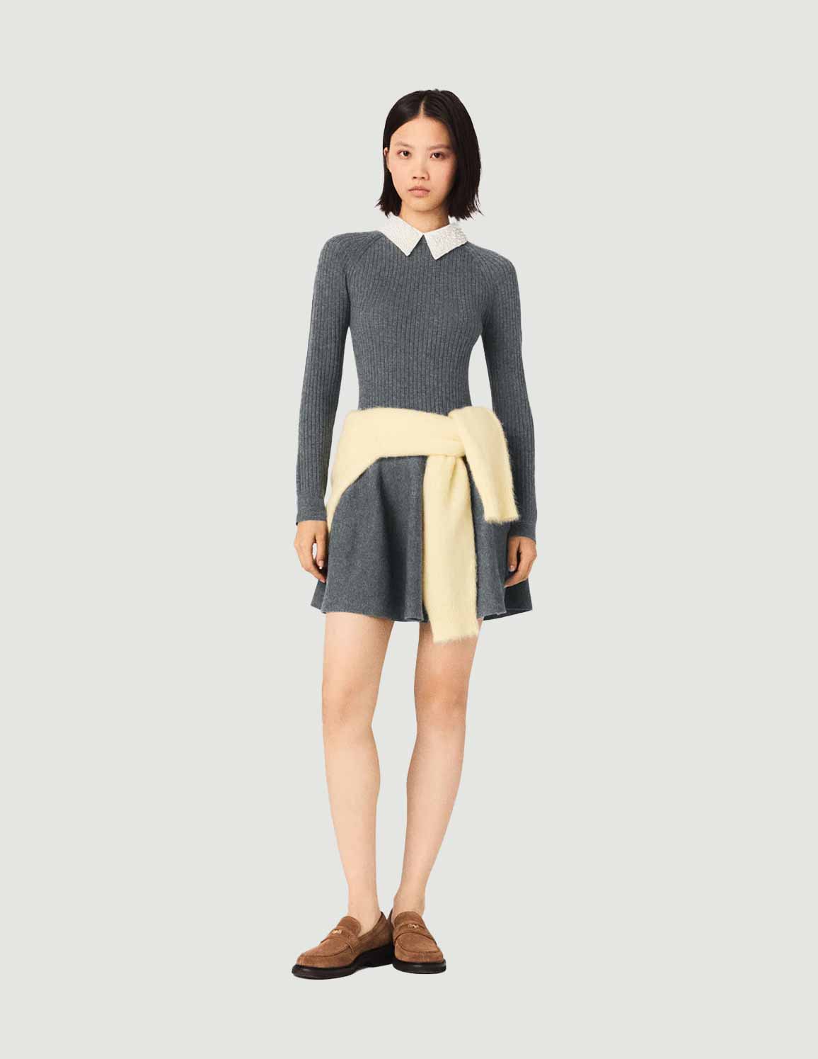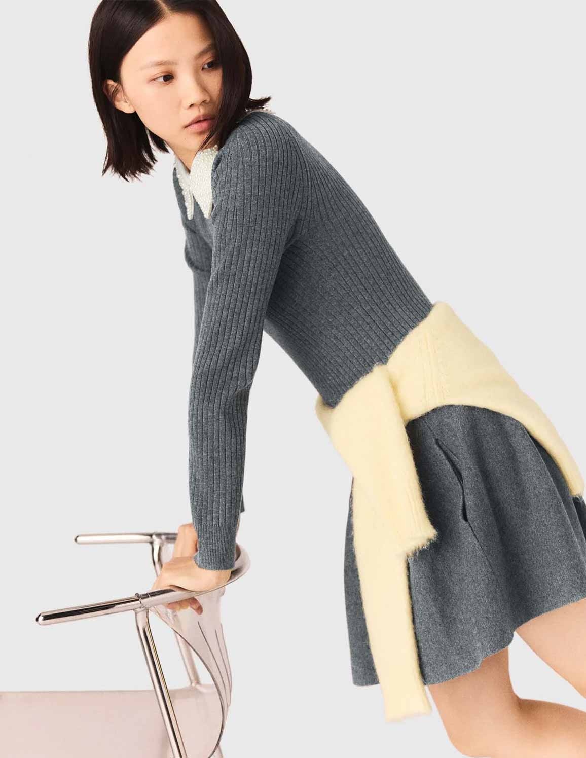 • This short fit-and-flare dress plays on contrasting textures: a fitted rib knit bodice, a smooth, structured skirt, and a fully beaded removable Peter Pan collar to give the silhouette a sophisticated twist. An essential piece for a graphic, feminine look that's both soft and assertive.