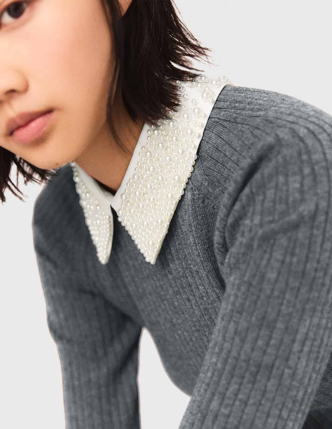 Beaded-collar short knit d...