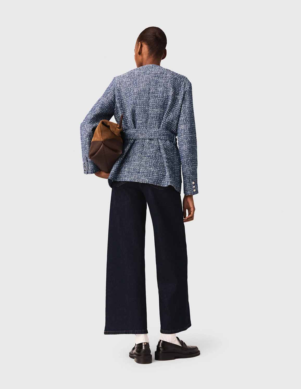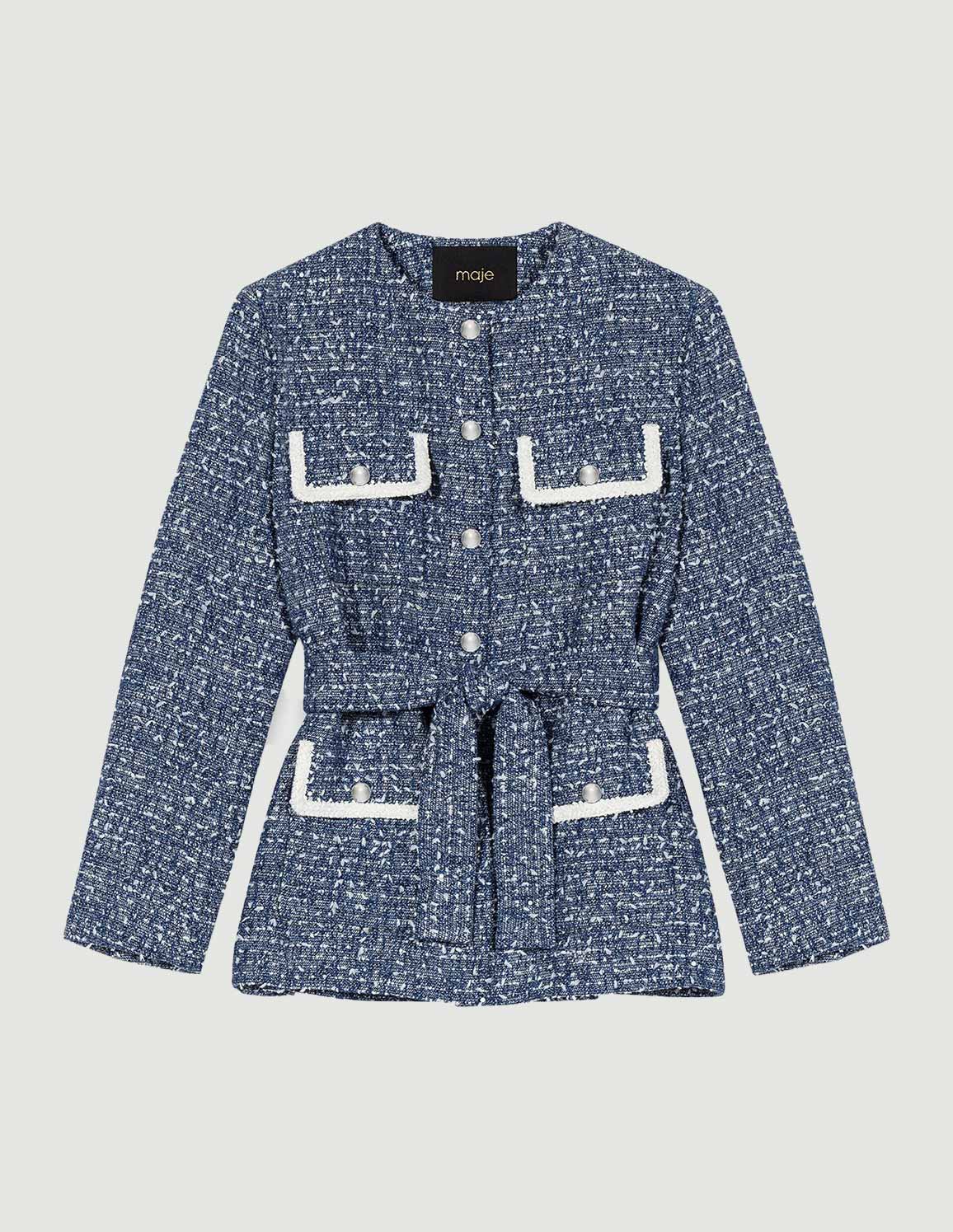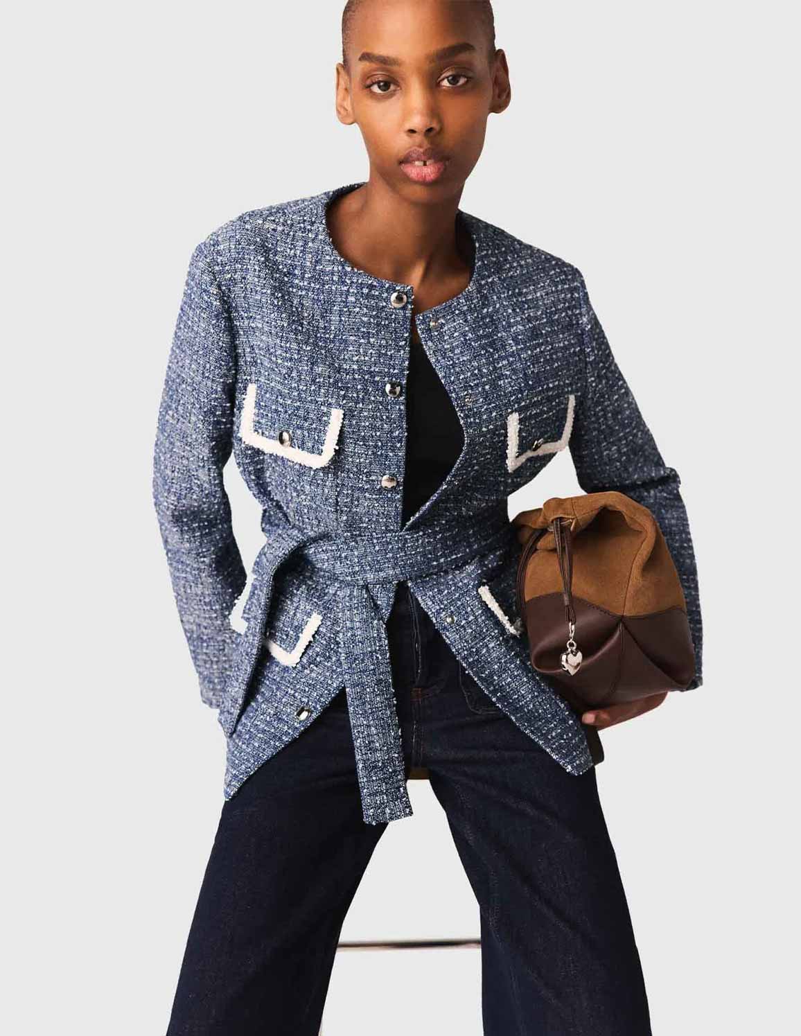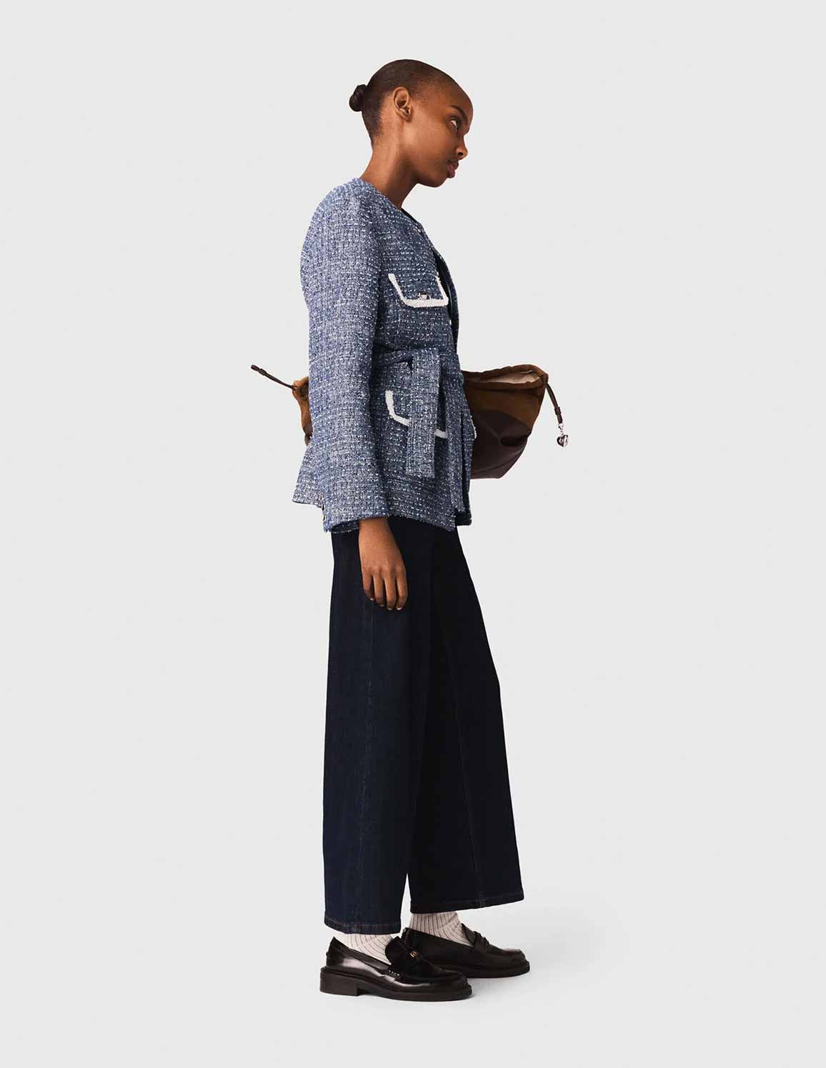 • Designed in a blue and white marled tweed, it has a straight cut, four patch pockets highlighted with ecru bouclé trim and a tie belt, for a structured and refined look. The silver press-studs and the clean finish of the edges create a chic style.