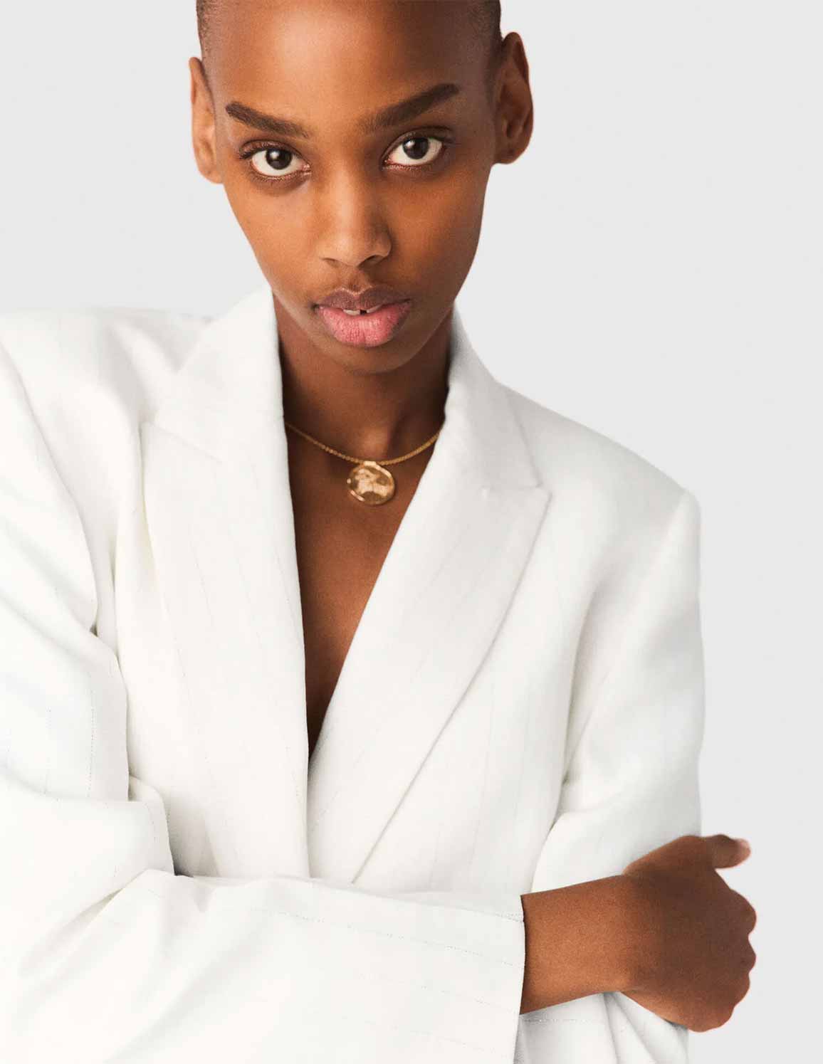 • Pair it with the matching trousers, and complete the look with a pair of camel pumps and a gold necklace for an assertive and refined silhouette.